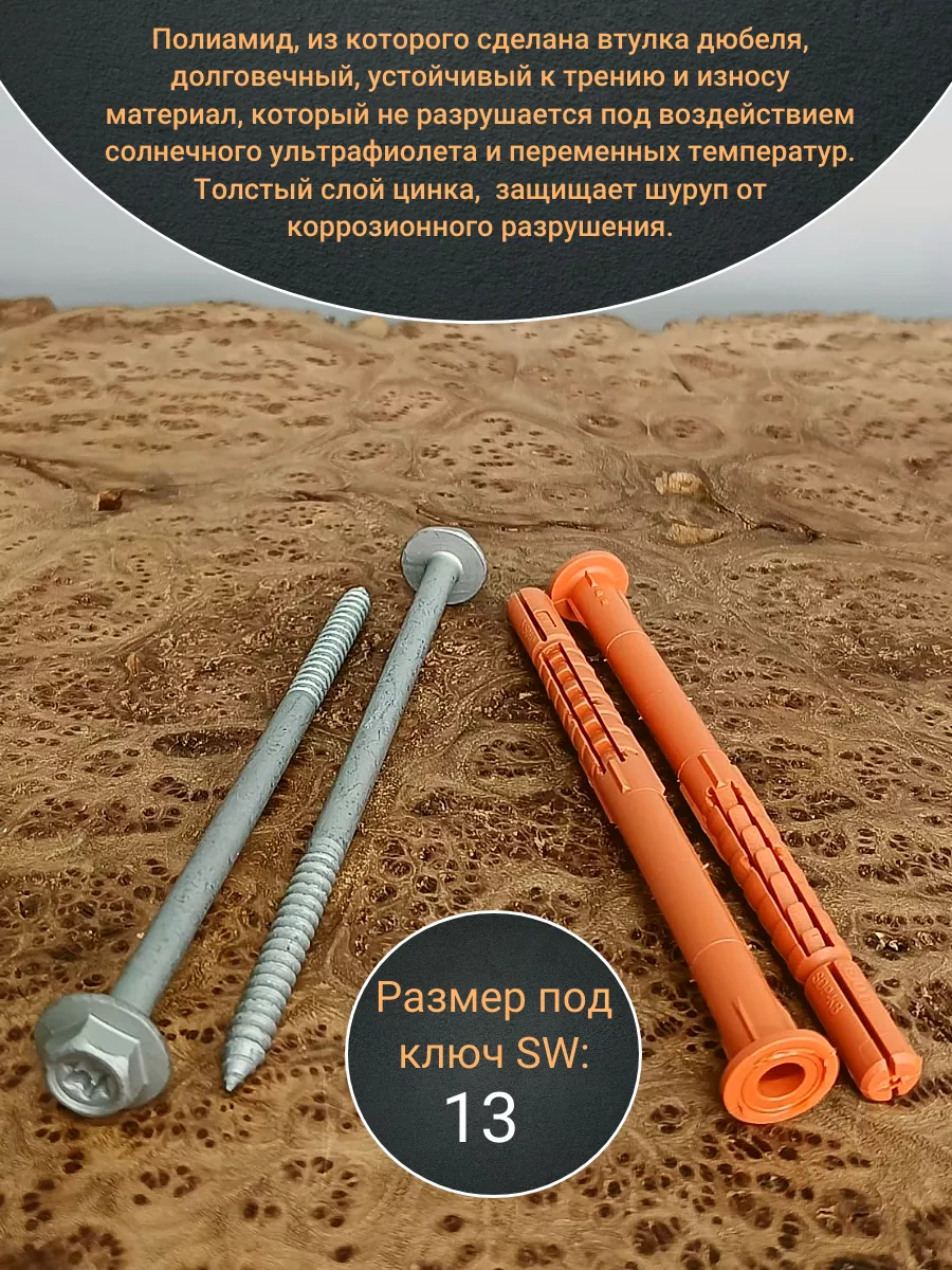 шуруп с 6-гранной головкой, пресс-шайбой и звездообразным шлицем Torx, выполненный из стали оцинкованной (толщина цинка 45 мкм) горячим методом. Применяется для монтажа кронштейнов систем навесного вентилируемого фасада и прочих навесных деталей из металла, для ненесущих избыточных систем, для конструктивного крепления навесных шкафов, отделки, металлических уголков к основаниям из ячеистого бетона В3,5.