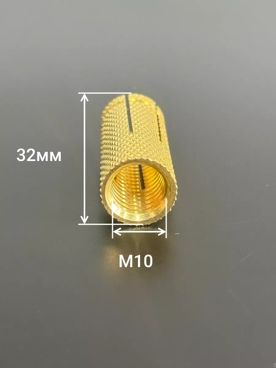 Анкер забивной латунный цанга М10 представляет собой простейшую и надежную конструкцию. Это небольшая втулка из латуни покрытая нарезкой для лучшего сцепления со стеной. Та часть, которая расположена в глубине отверстия, имеет деление на четыре сегмента. Эти сегменты предназначены для обеспечения надежного распора и крепления в теле стены.