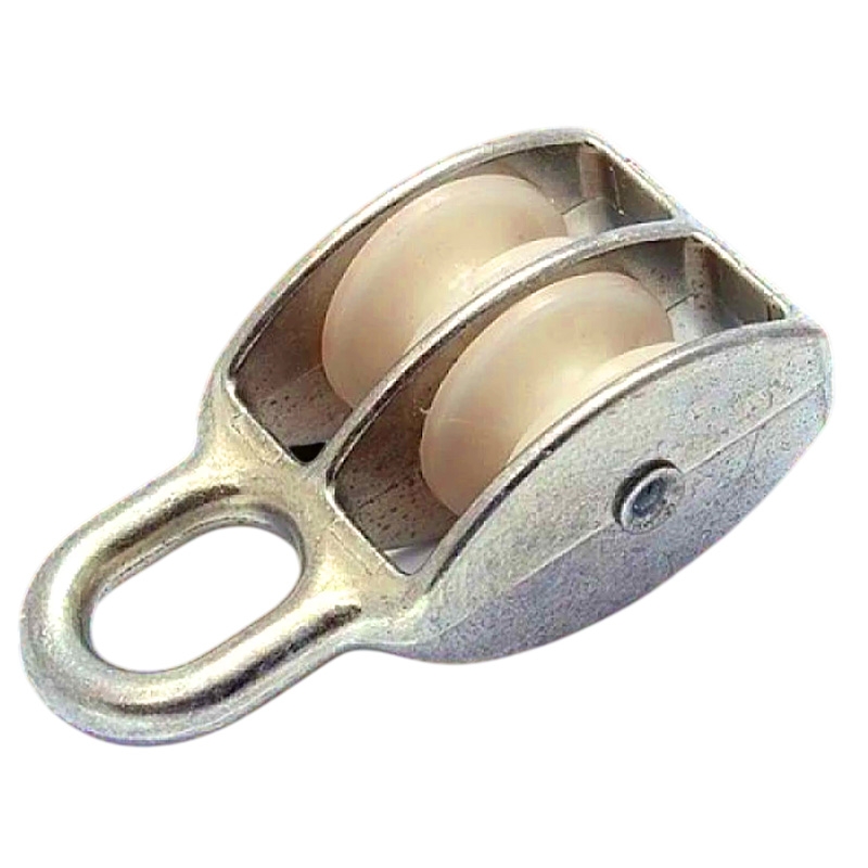Двойной блок изготовлен в виде сдвоенного одинарного блока. На нем расположены два ролика, которые легко вращаются и пропуская трос перенаправляют его. Используют в грузоподъемных работах для подвешивания и изменения движения тросов и канатов. Изделие создает низкое трение. Проявляет устойчивость к износу при контакте с неметаллическими тросами. Компактный размер с небольшим весом позволяет легко работать с монтажем блока.