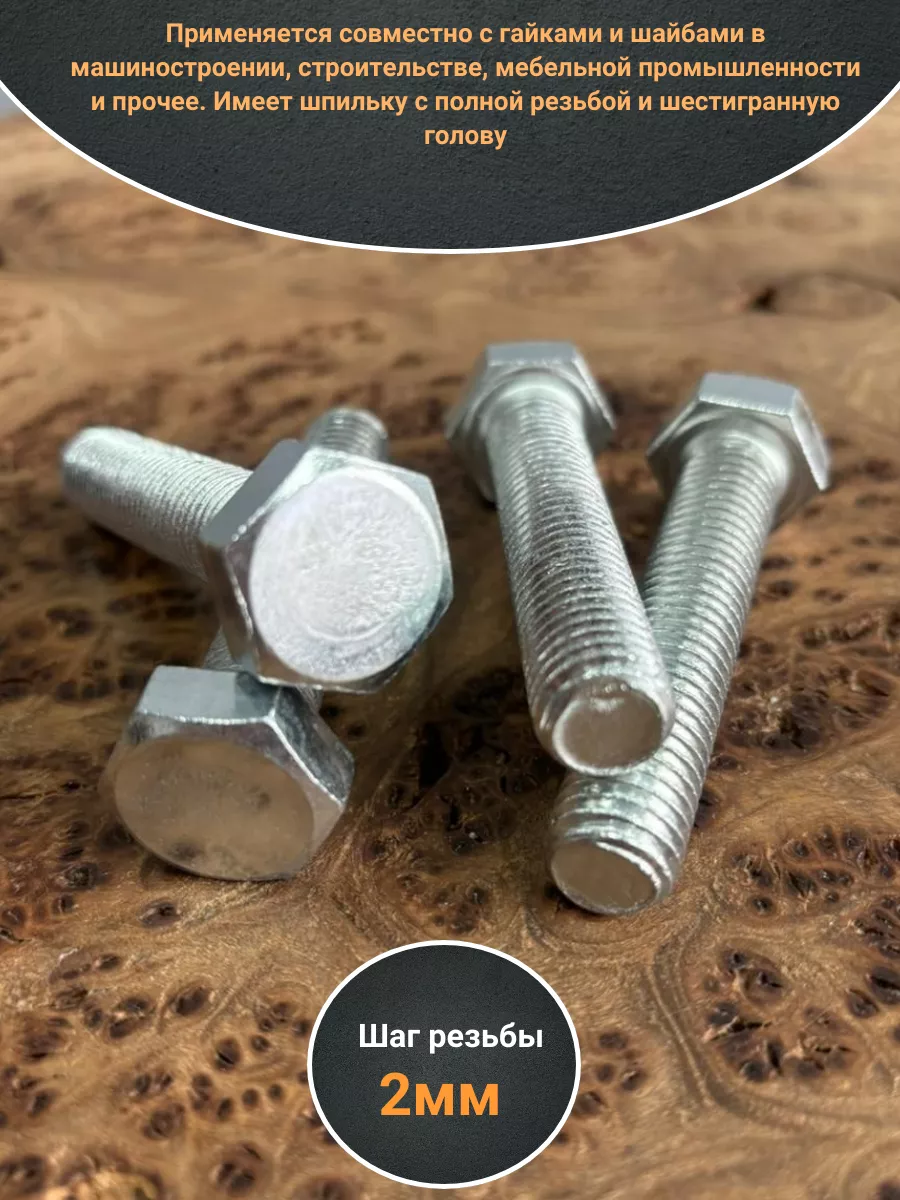Имеет шпильку с полной резьбой и шестигранную голову. Длина болта определяется по длине шпильки. Стандартный класс прочности для болтов от 4,8 до 5,8. Самый распространенный вид болтов применяется совместно с гайками и шайбами.