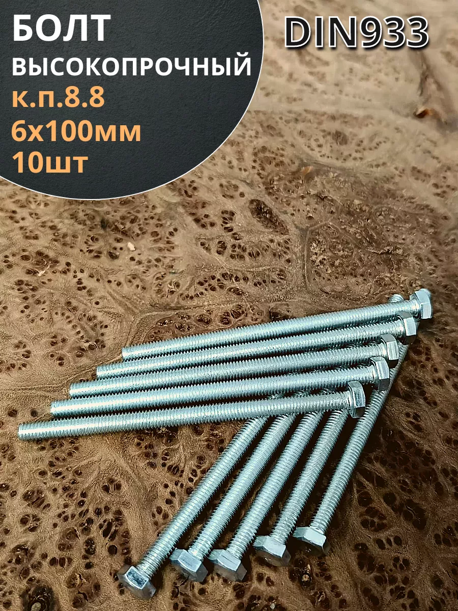 Болт 6х100 мм полная резьба ОЦ DIN933 к.п.8.8 (10 шт.)