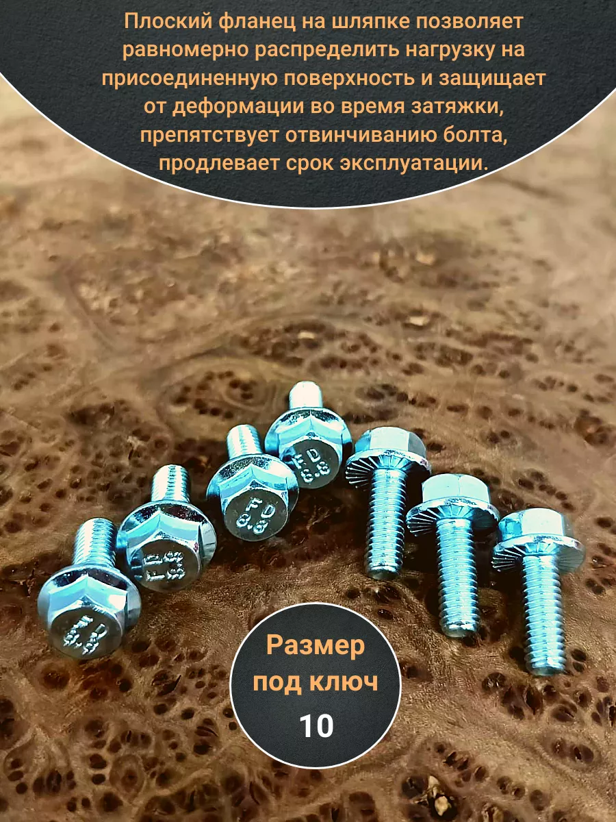 Болт с шестигранной головкой и фланцем используют как крепление различных деталей или конструкций. Данный болт используют только вместе с шайбой или гайкой. Болт DIN 6921 изготавливают из оцинкованной стали. Модель имеет как резьбу на 4/5 длине стержня, так и полную резьбу, а так же плоский фланец и шестигранную головку. Данная модель пользуется популярностью на строительно-монтажных площадках, установка болта не требует использование отдельной шайбы.