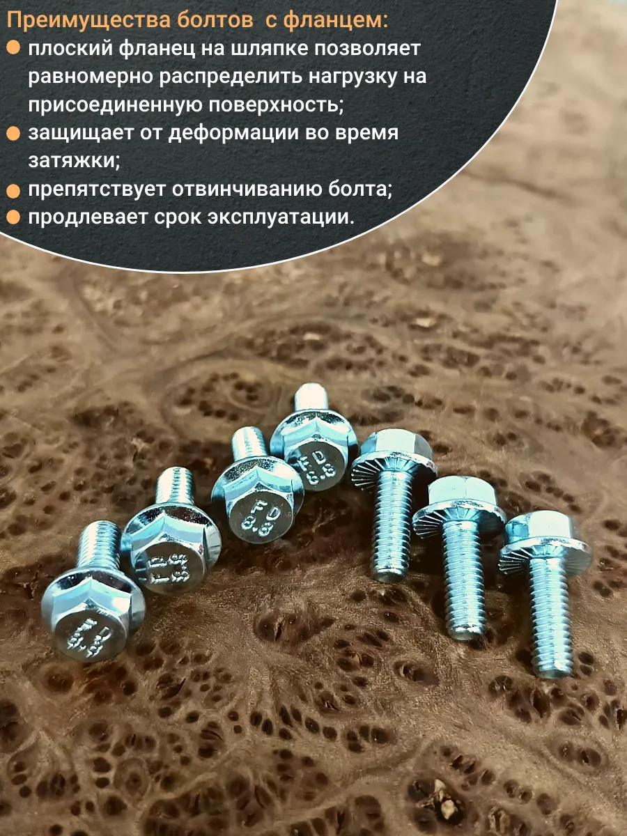 Болт с шестигранной головкой и фланцем используют как крепление различных деталей или конструкций. Данный болт используют только вместе с шайбой или гайкой. Болт DIN 6921 изготавливают из оцинкованной стали. Модель имеет как резьбу на 4/5 длине стержня, так и полную резьбу, а так же плоский фланец и шестигранную головку. Данная модель пользуется популярностью на строительно-монтажных площадках, установка болта не требует использование отдельной шайбы