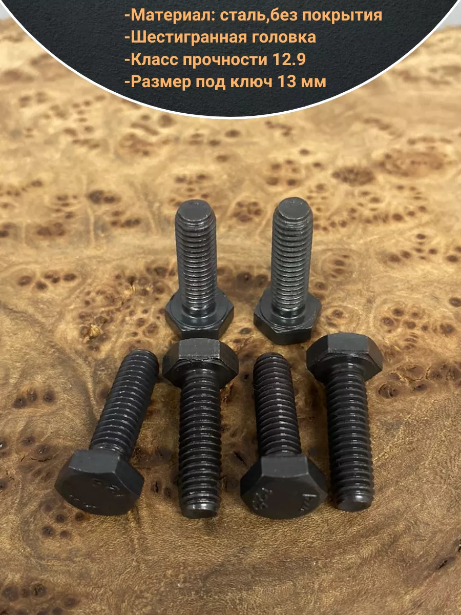Материал: Сталь 12.9. Применяется совместно с гайками и шайбами в машиностроении, строительстве, мебельной промышленности и прочее. Имеет шпильку с полной резьбой и шестигранную голову. Длина болта определяется по длине шпильки. Самый распространенный вид болтов применяется совместно с гайками и шайбами.