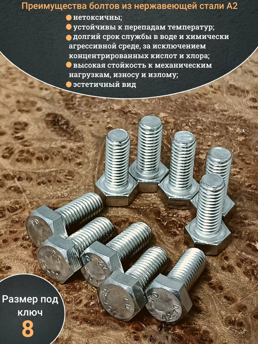 Материалом для болта служит нержавеющая сталь класса A2. У изделия есть цилиндрический стержень c полной резьбой М5 и шестигранная головка. Шляпка передает крутящий момент от ключа к крепежу при завинчивании. Для создания прочных резьбовых соединений крепеж используется в комбинации с шайбой и гайкой или завинчивается в отверстия с нарезанной резьбой. Чтобы исключить электрохимическую коррозию, шайбы с гайкой делаются из коррозионно-устойчивой стали либо нейтральных полимерных материалов.