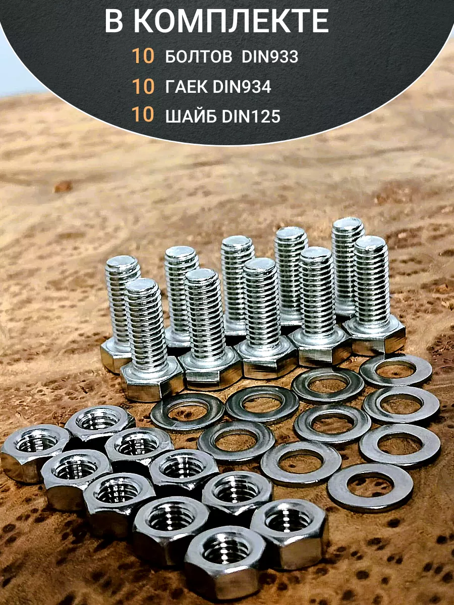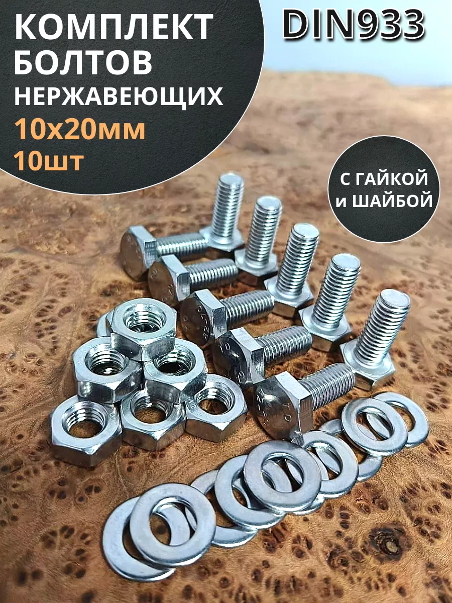 Болт нержавеющий 10х20 мм DIN933 с гайкой и шайбой, 10шт.