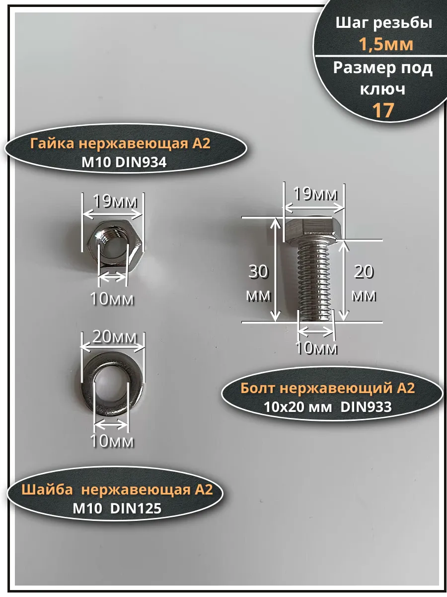 | Болт нержавеющий 10х20 мм DIN933 с гайкой и шайбой, 10шт. | 11471 | 1 шт. |