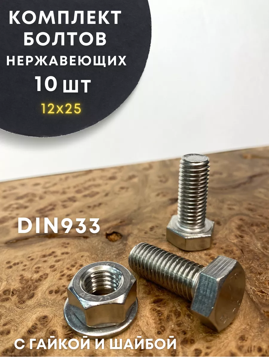 Болт нержавеющий 12х25 DIN933 с гайкой и шайбой, 10 шт.