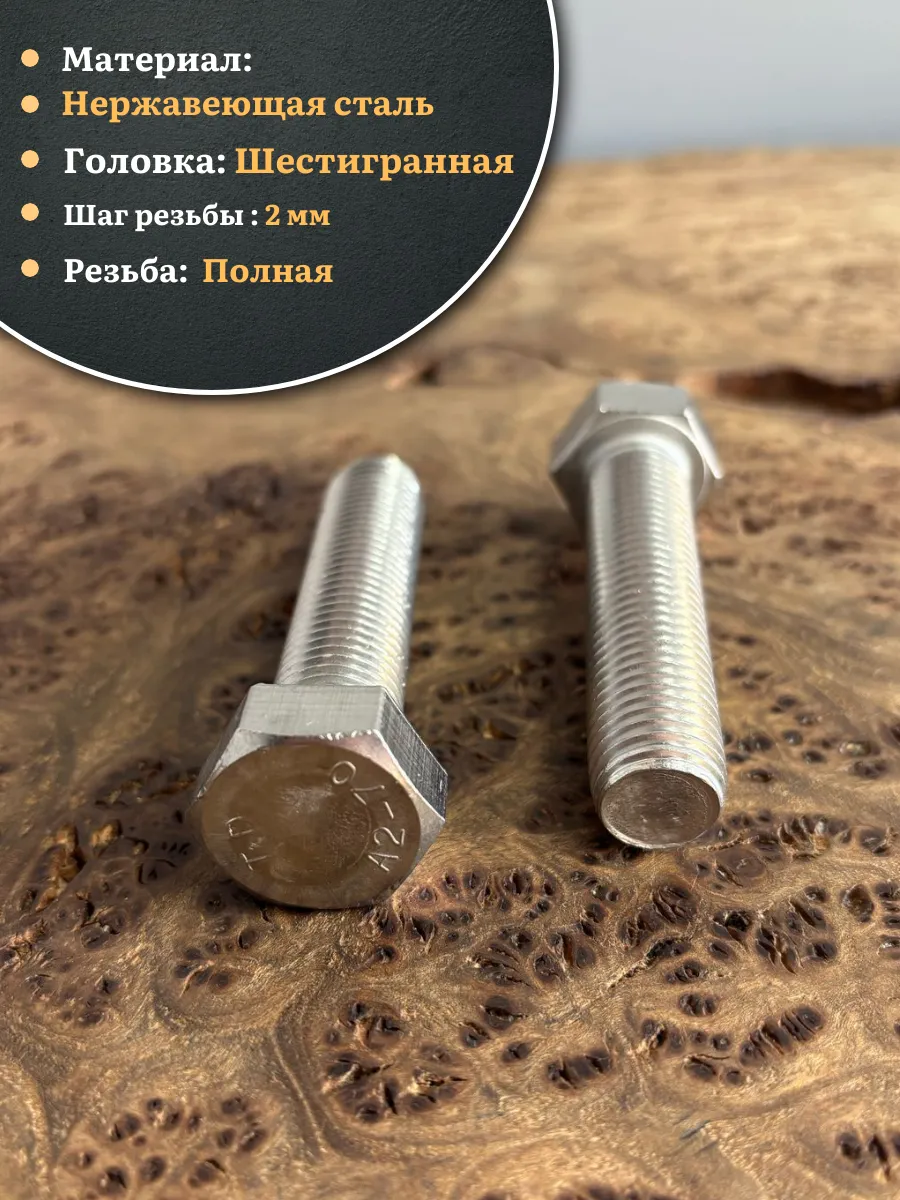 Материалом для болта служит нержавеющая сталь класса A2. У изделия есть цилиндрический стержень c полной резьбой М5 и шестигранная головка. Шляпка передает крутящий момент от ключа к крепежу при завинчивании. Для создания прочных резьбовых соединений крепеж используется в комбинации с шайбой и гайкой или завинчивается в отверстия с нарезанной резьбой. Чтобы исключить электрохимическую коррозию, шайбы с гайкой делаются из коррозионно-устойчивой стали либо нейтральных полимерных материалов.