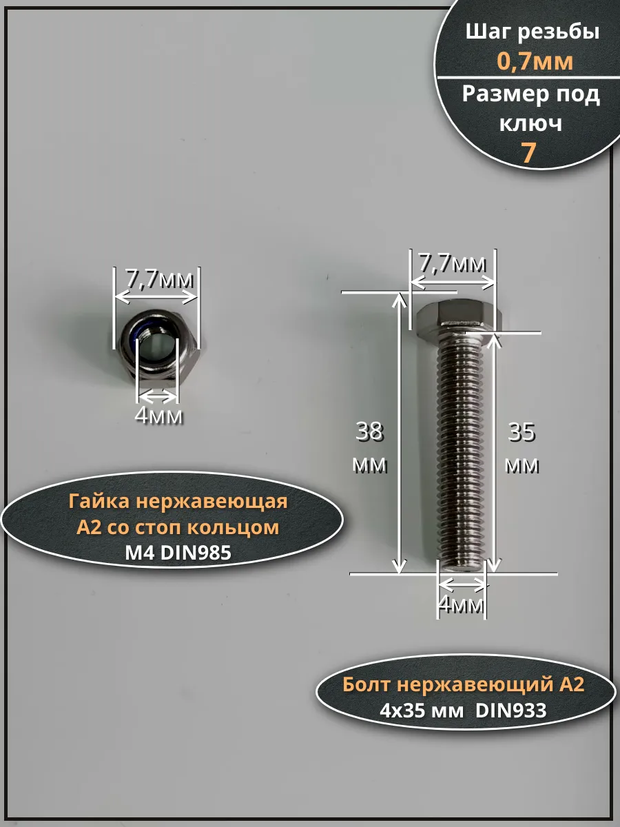 Болт нержавеющий 4х35 мм DIN 933 со стоп гайкой , 100 шт.