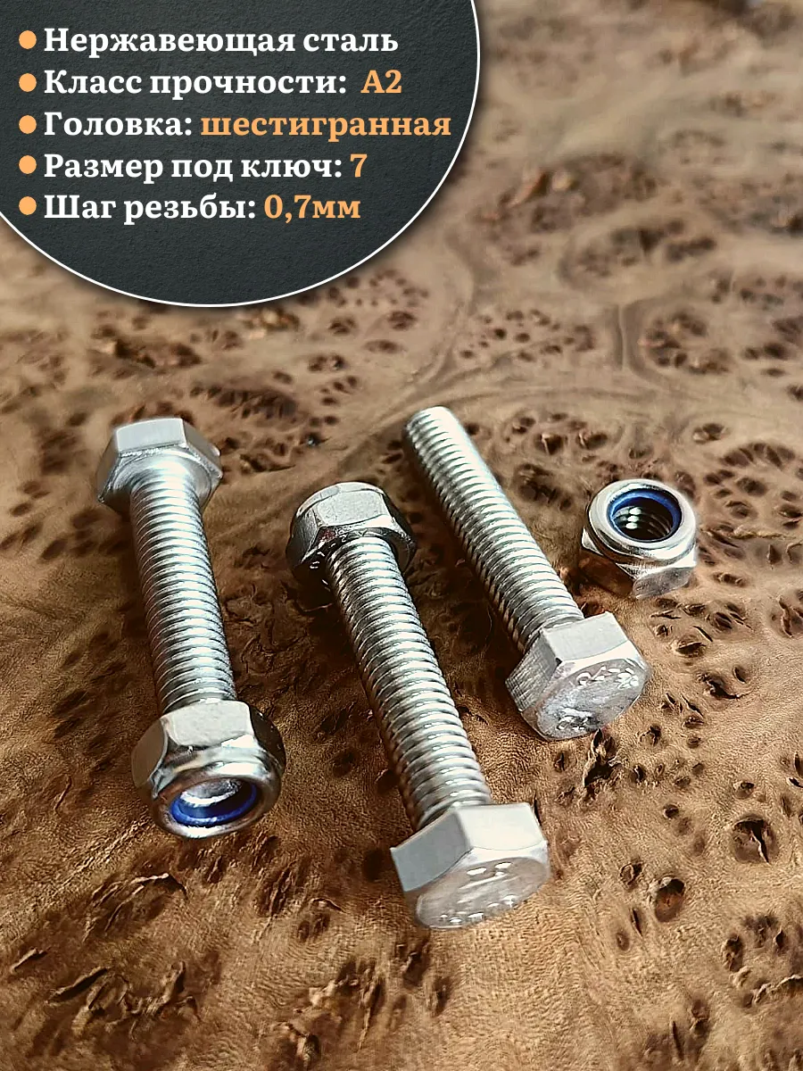 Набор: болт нержавеющий 4х35 мм DIN933 - 10 шт., Гайка со стоп.кольцом нержавеющая М4 DIN985-10 шт. Нержавеющий болт, сделанный в соответствии с DIN 933, применяют в процессе сборки корпусной мебели, установки монтажных профилей на несущие конструкции помещений, изготовления механизмов, агрегатов в энергетике и судостроении. Материалом для болта служит нержавеющая сталь класса A2. У изделия есть цилиндрический стержень c полной резьбой М4 и шестигранная головка. Шляпка передает крутящий момент от ключа к крепежу при завинчивании. Для создания прочных резьбовых соединений крепеж используется в комбинации с шайбой и гайкой или завинчивается в отверстия с нарезанной резьбой. Чтобы исключить электрохимическую коррозию, шайбы с гайкой делаются из коррозионно-устойчивой стали либо нейтральных полимерных материалов. Нержавеющая сталь данной марки повышает прочность болта, который выдерживает динамические усилия и вибрацию. Изделие монтируют в помещениях и вне их. Крепеж имеет практически неограниченный ресурс работы
