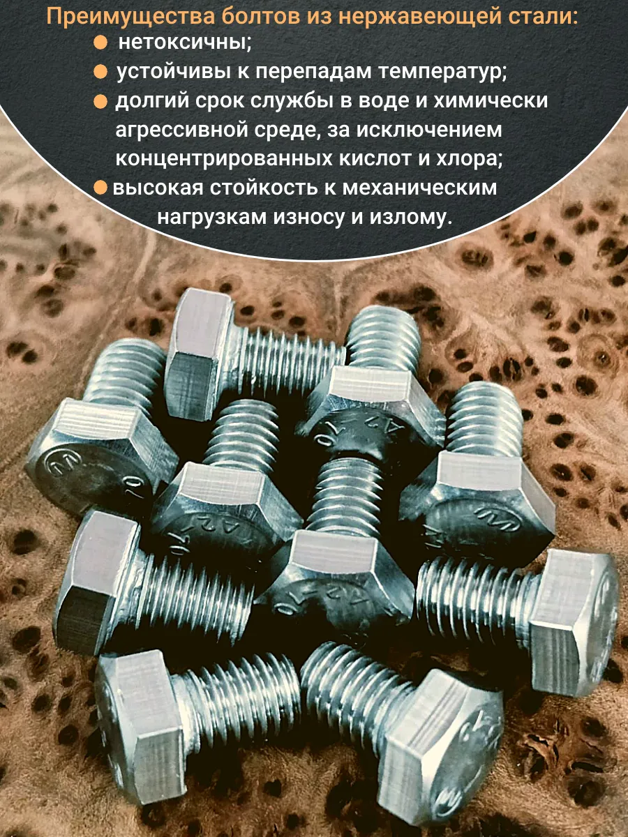 Нержавеющая сталь данной марки повышает прочность болта, который выдерживает динамические усилия и вибрацию. Изделие монтируют в помещениях и вне их. Крепеж имеет практически неограниченный ресурс работы, на который не влияет воздействие воды и изменений температуры воздуха.