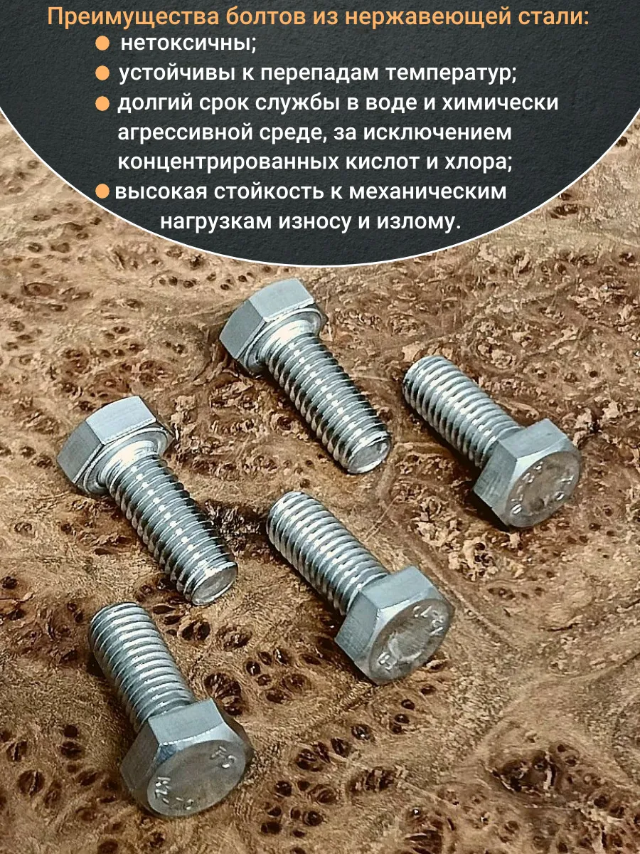 Нержавеющая сталь данной марки повышает прочность болта, который выдерживает динамические усилия и вибрацию. Изделие монтируют в помещениях и вне их. Крепеж имеет практически неограниченный ресурс работы, на который не влияет воздействие воды и изменений температуры воздуха.