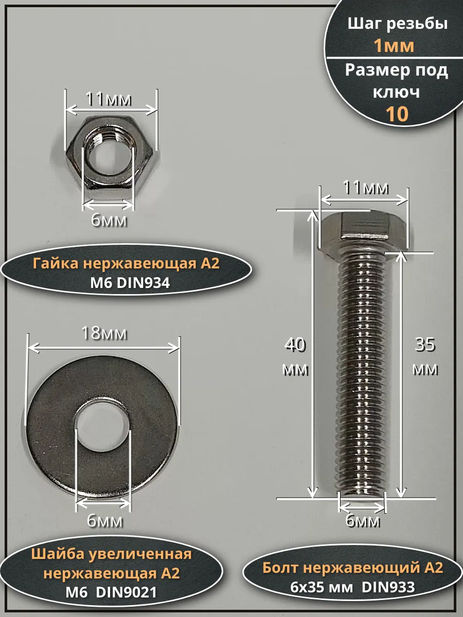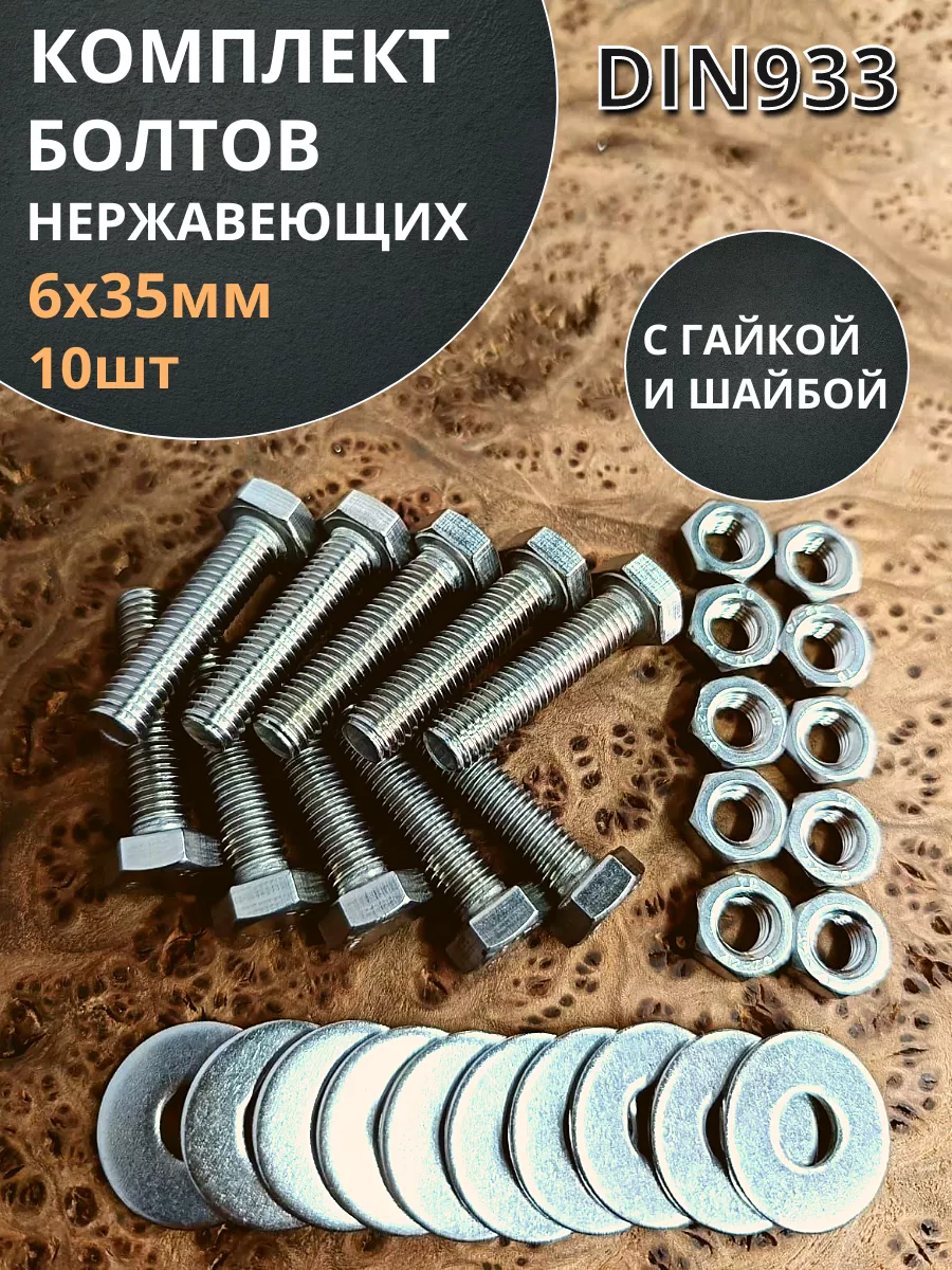 | Болт нержавеющий 6х35 мм DIN933 с гайкой и шайбой, 10шт. | 33334 | 1 шт. |