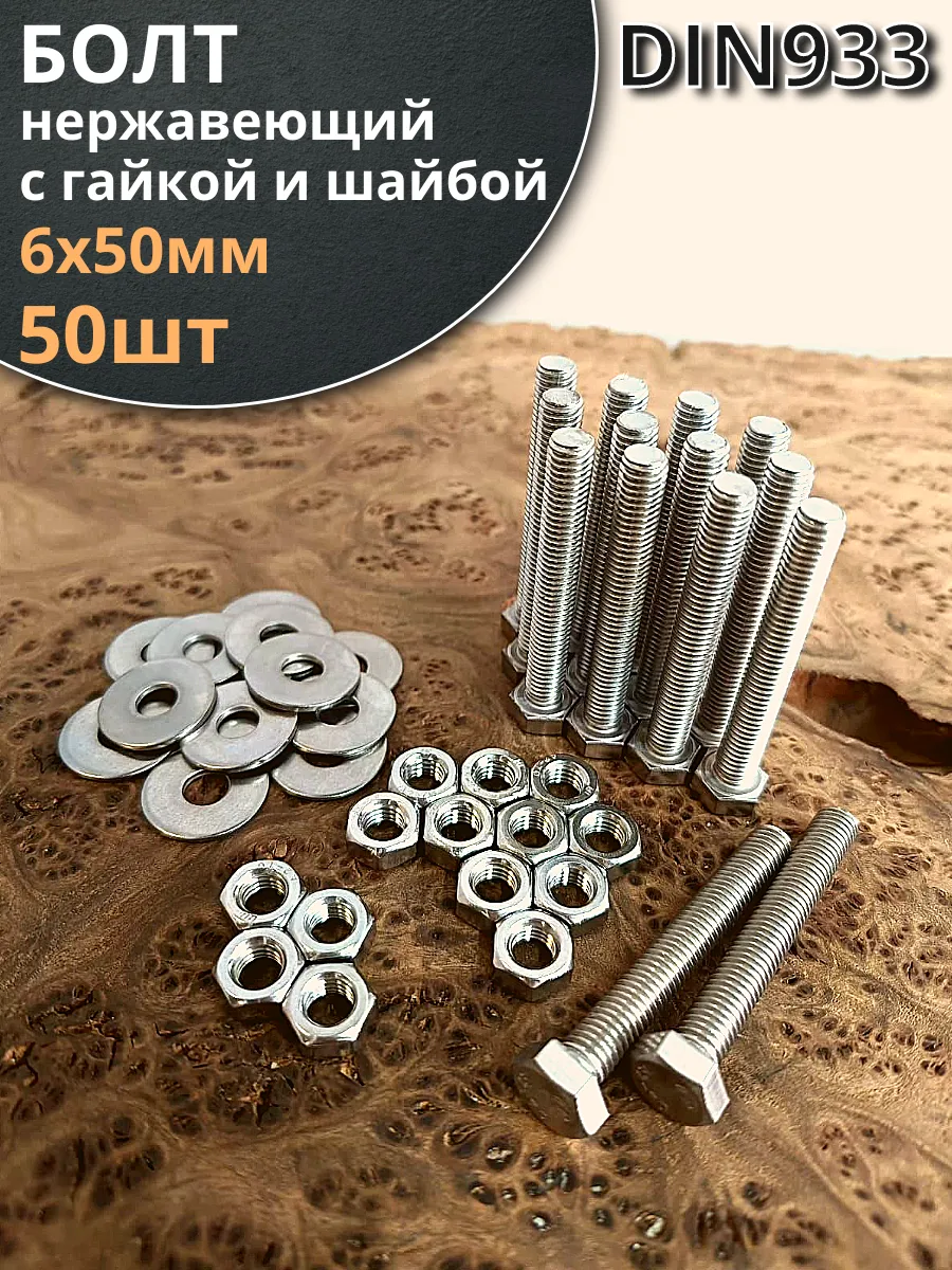 | Болт нержавеющий 6х50 мм DIN933 с гайкой и шайбой, 50шт. | 33376 | 1 шт. |