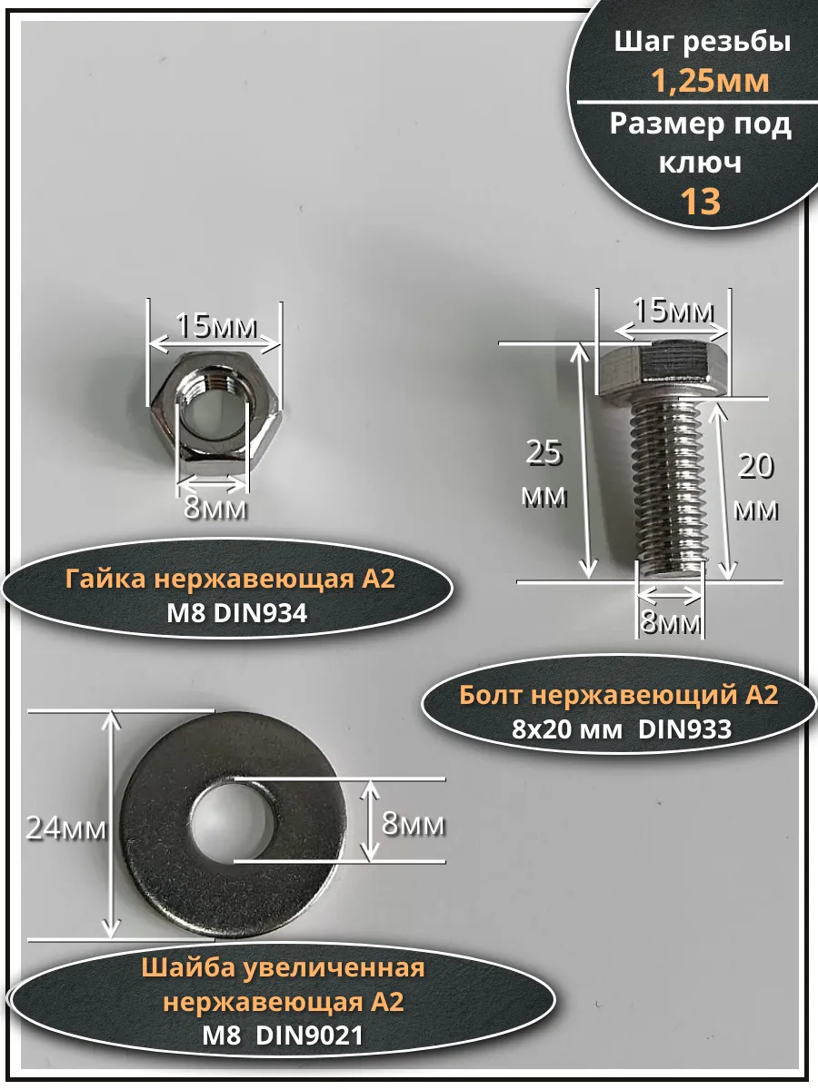 | Болт нержавеющий 8х20 мм DIN933 с гайкой и шайбой, 10шт. | 33341 | 1 шт. |