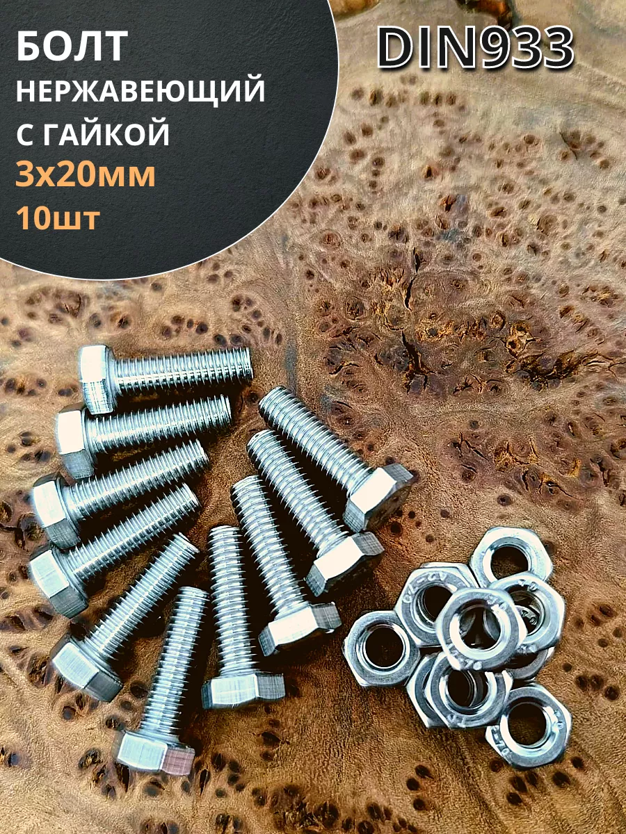 Болт нержавеющий М3х20 мм DIN 933 с гайкой , 10 шт.
