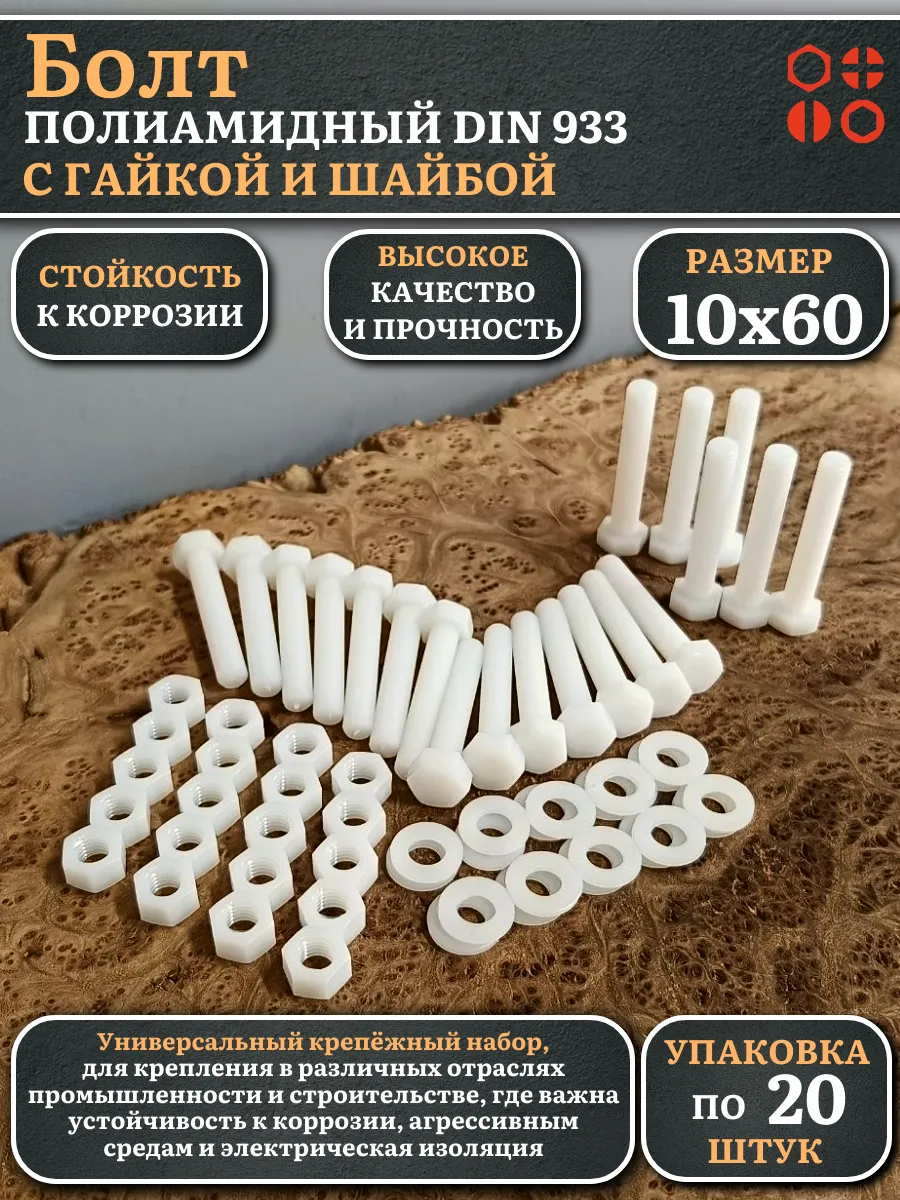 | Болт полиамидный 10х60 мм DIN 933 с гайкой и шайбой, по 10 шт. | бп1060933наборГШф10 | 1 шт. |