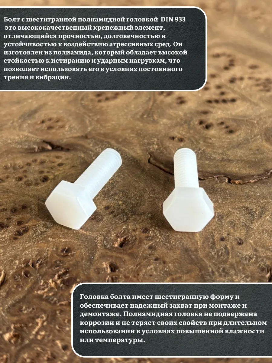 Болт с шестигранной головкой из полиамида (пластика) DIN 933, полная резьба, обладает прочностью, хорошими теплоизоляционными характеристиками и отличными антикоррозийными свойствами. Резьба на данных изделиях - метрическая, наносят ее методом горячей накатки.