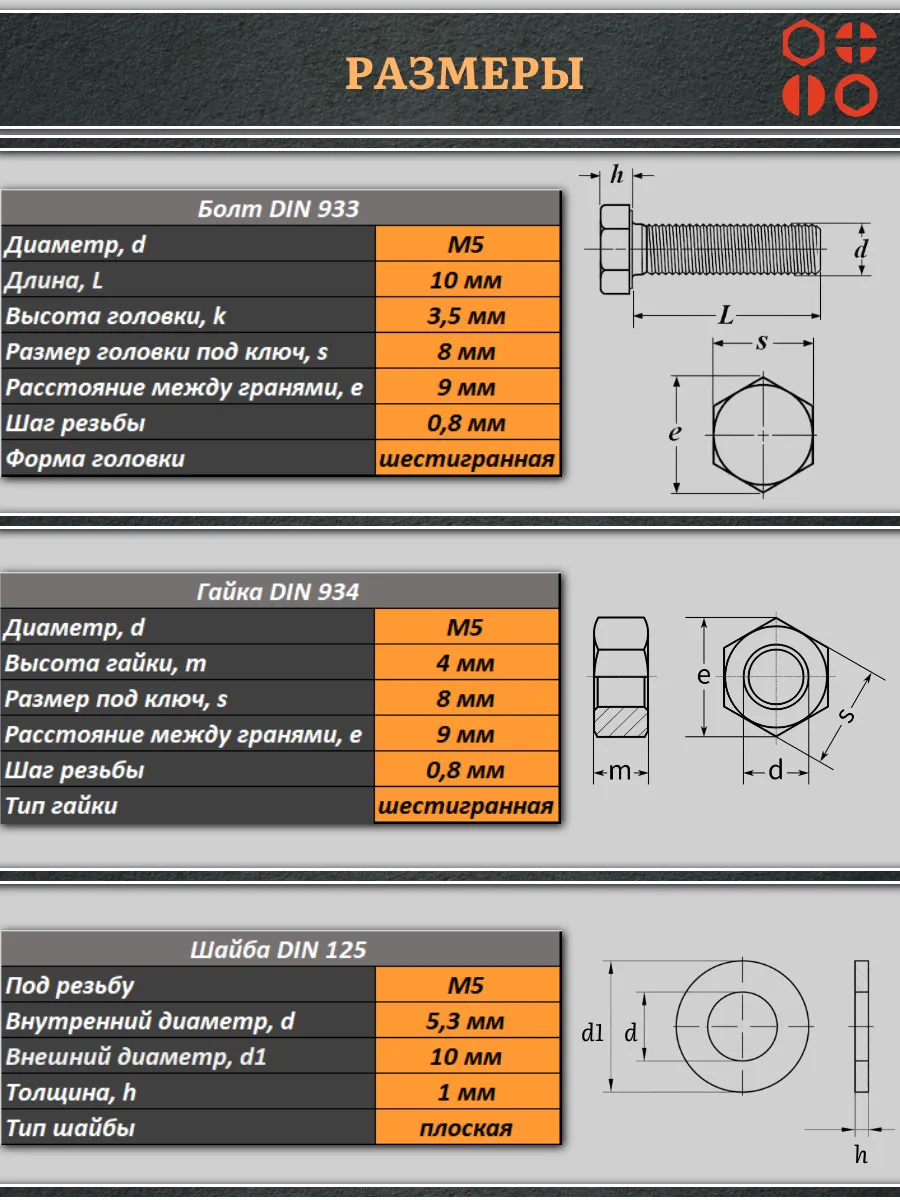 | Болт полиамидный 5х10 мм DIN 933 с гайкой и шайбой, по 10 шт. | бп510933наборГШф10 | 1 шт. |