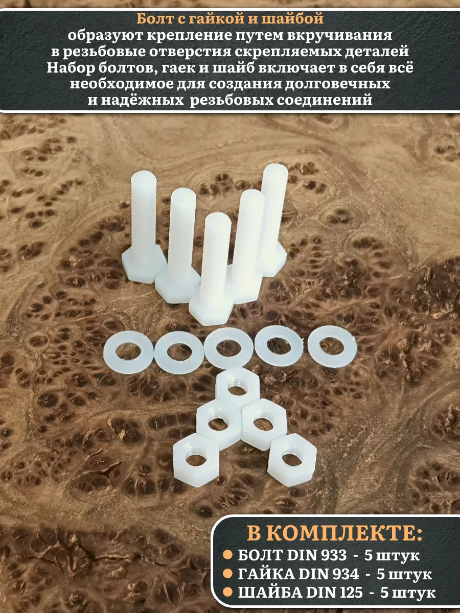 Болт полиамидный 6х30 мм DIN 933 с гайкой и шайбой, по 5 шт.