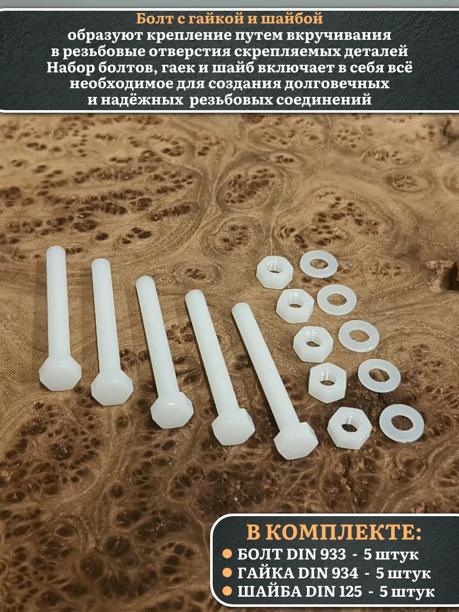 Болт полиамидный 6х50 мм DIN 933 с гайкой и шайбой, по 5 шт.