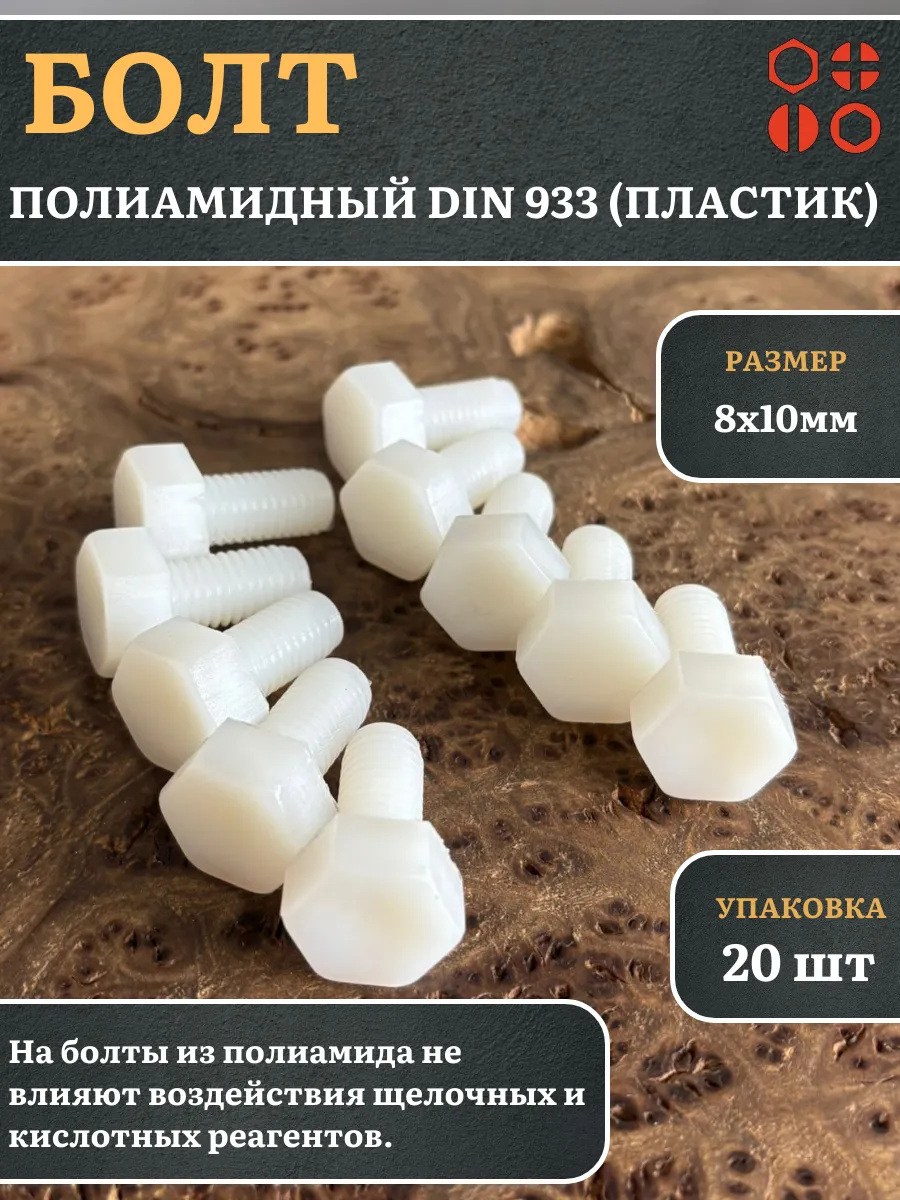 Болт полиамидный 8х10 мм DIN 933 (пластик), 20 шт.