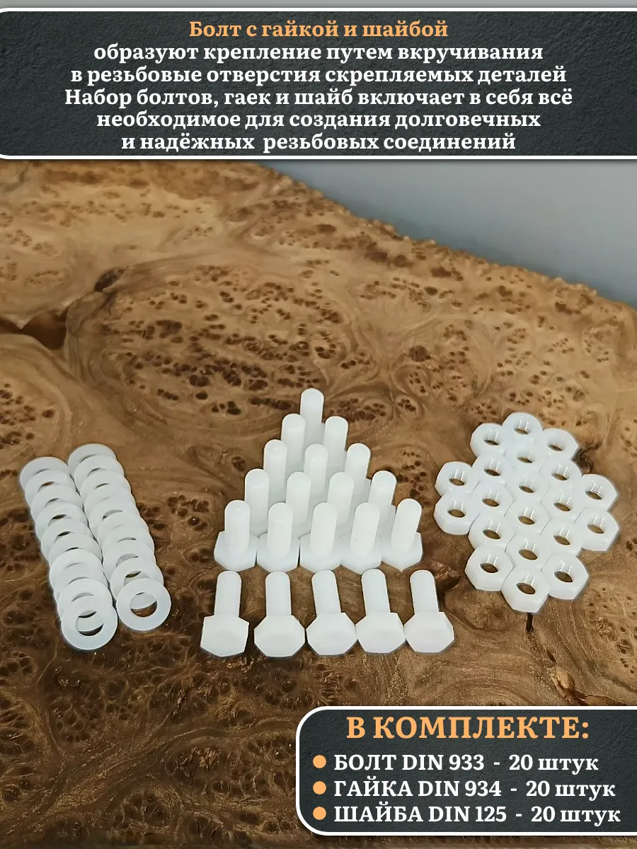 Болт полиамидный 8х20 мм DIN 933 с гайкой и шайбой, по 20 шт.