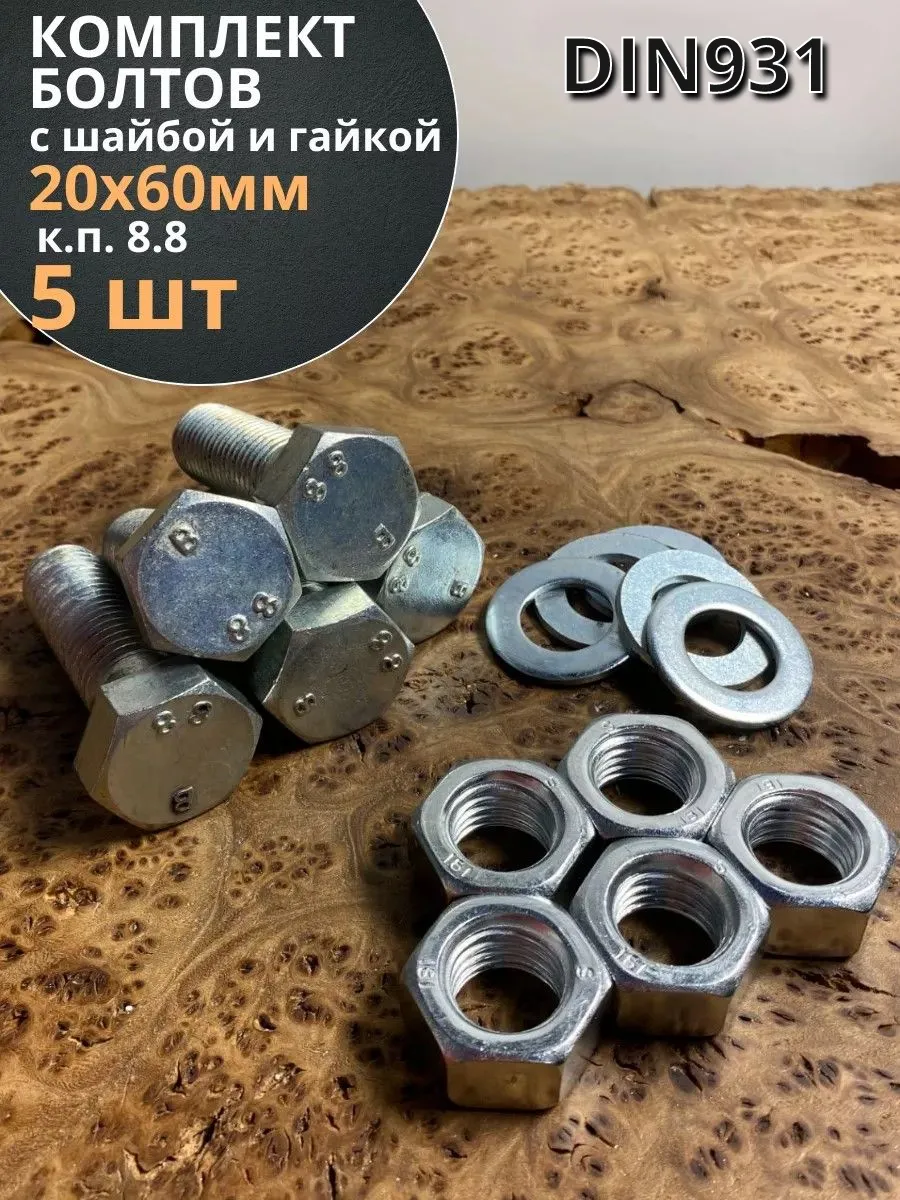 Болт 20х60 мм с гайкой и шайбой ОЦ DIN931 к.п.8.8 (5 шт)