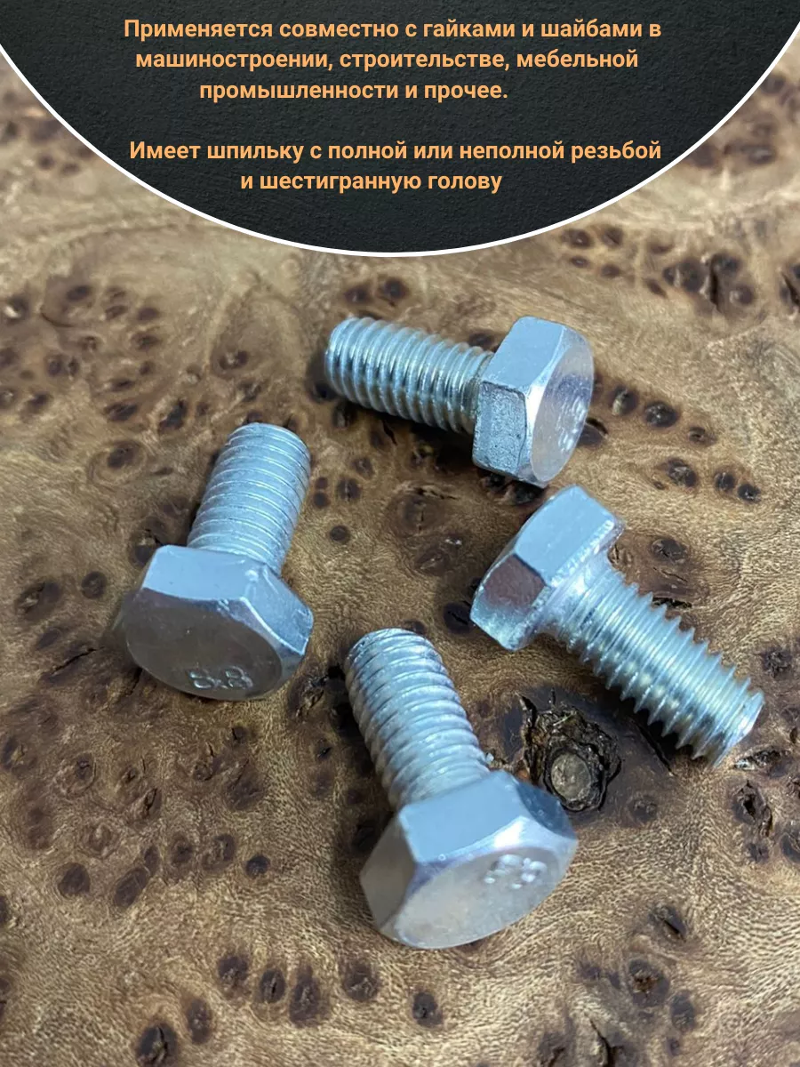 Применяется совместно с гайками и шайбами в машиностроении, строительстве, мебельной промышленности и прочее. Имеет шпильку с полной или неполной резьбой и шестигранную голову. Длина болта определяется по длине шпильки.