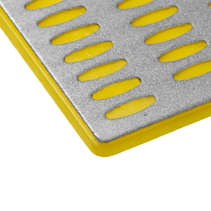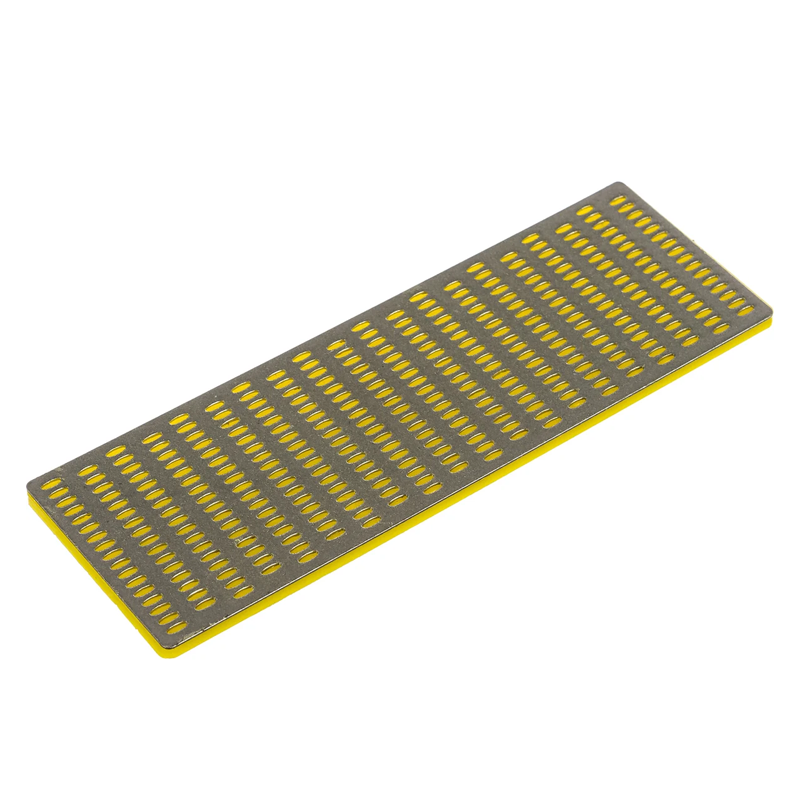 Брусок абразивный алмазный 150х50 мм, Р400 (желтый) предназначен для заточки и финишной доводки ножей, ножниц и маникюрных инструментов. Мелкая зернистость предназначена для окончательной обработки и полировки режущей кромки, обеспечивая высокую остроту и гладкость поверхности. Перфорация на поверхности пластины защищает её от забивания частицами абразивной и металлической пыли, что способствует более эффективной и качественной заточке. Мелкая зернистость позволяет добиться высокой точности и остроты режущей кромки.
