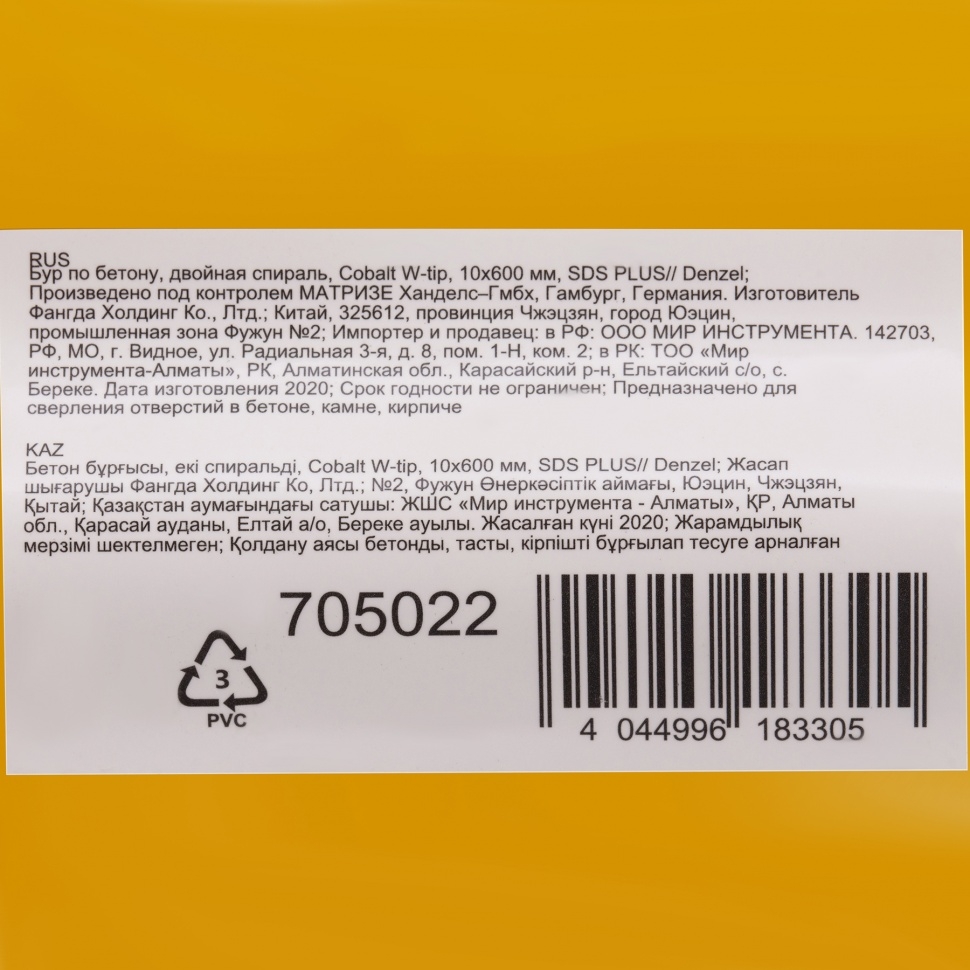 Бур по бетону Denzel арт. 705022 с хвостовиком SDS PLUS и двойной спиралью предназначен для сверления бетона, кирпича и камня. Он используется в качестве оснастки для перфораторов с патроном SDS Plus. Бур оптимален для проведения строительных, ремонтных, монтажных работ. Преимущества Продуманная конструкция — режущая твердосплавная пластина из стали ВК8 80-90 HRC с W-образной заточкой имеет высокий ресурс и способна сверлить отверстия до 30% быстрее, в том числе при работе с камнем. Прочность и износостойкость — рабочая часть из легированной стали 40Х выдерживает интенсивные и длительные ударные нагрузки, а также делает бур самым высокопроизводительным среди аналогов средней цены. Двойная спираль и канавка с дополнительным желобом — за счет более эффективного отвода шлама рабочая часть не перегревается, такая разработка позволяет продлить срок службы бура. Высокая технологичность — буры Denzel изготавливаются на производстве MAKITA, что гарантирует их качество и эффективность сверления. Бур поставляется в у