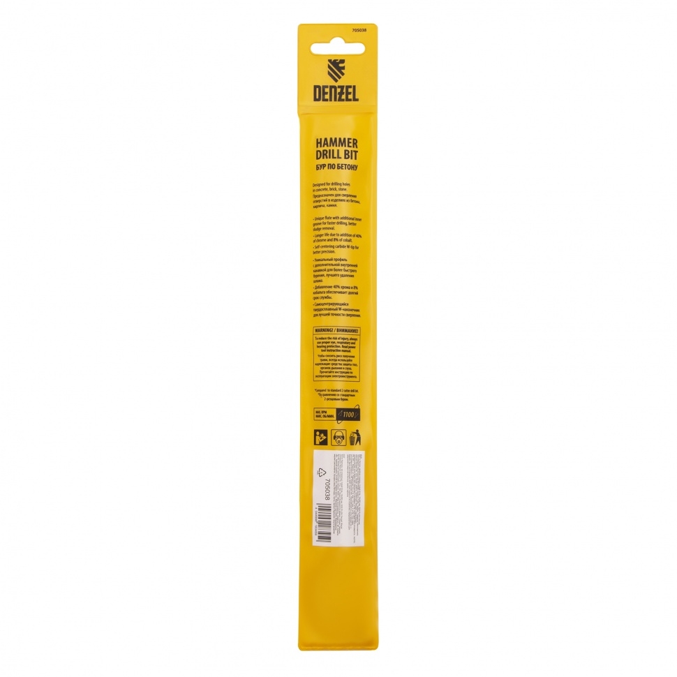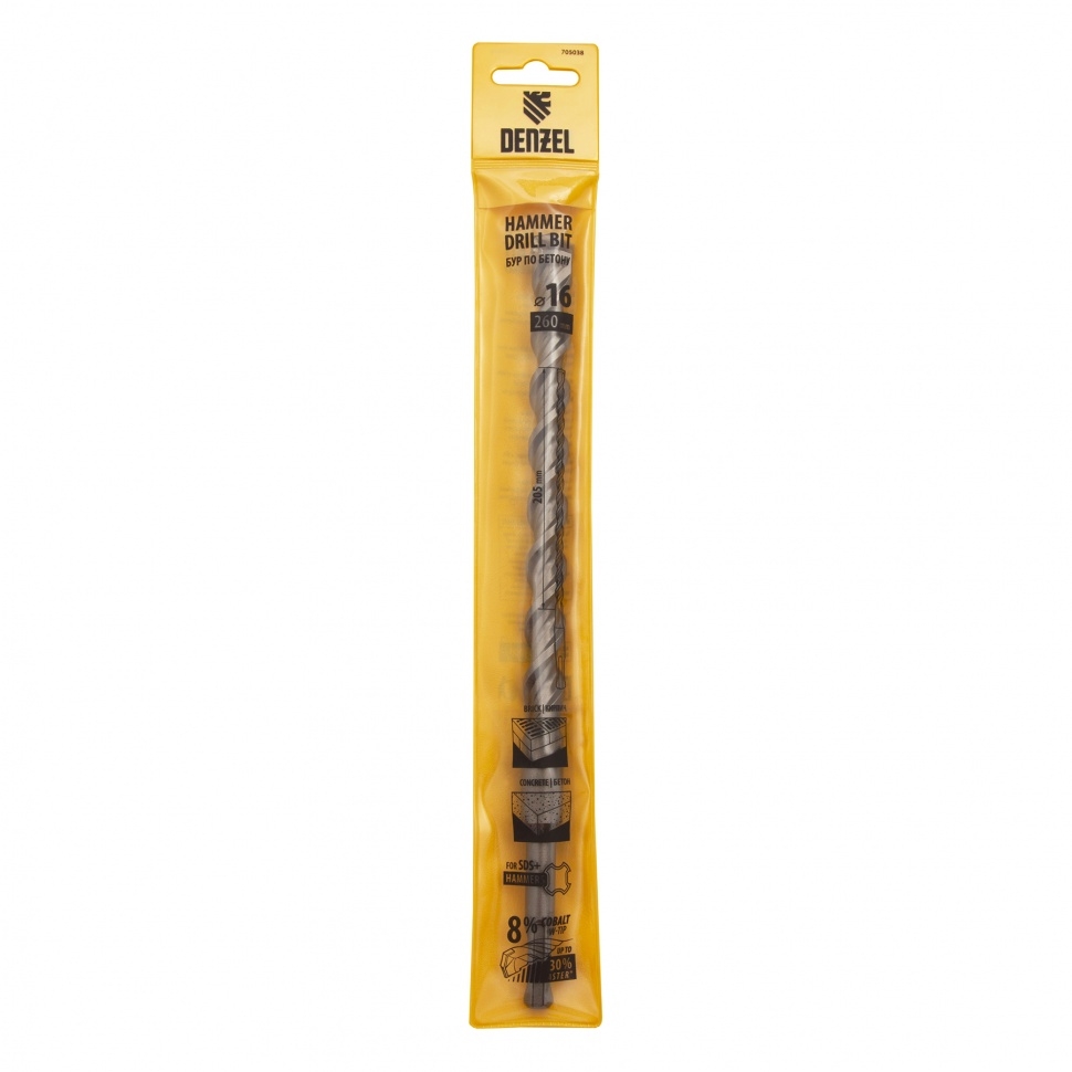 Бур по бетону Denzel арт. 705038 с хвостовиком SDS PLUS и двойной спиралью предназначен для сверления бетона, кирпича и камня. Он используется в качестве оснастки для перфораторов с патроном SDS Plus. Бур оптимален для проведения строительных, ремонтных, монтажных работ. Преимущества Продуманная конструкция — режущая твердосплавная пластина из стали ВК8 80-90 HRC с W-образной заточкой имеет высокий ресурс и способна сверлить отверстия до 30% быстрее, в том числе при работе с камнем. Прочность и износостойкость — рабочая часть из легированной стали 40Х выдерживает интенсивные и длительные ударные нагрузки, а также делает бур самым высокопроизводительным среди аналогов средней цены. Двойная спираль и канавка с дополнительным желобом — за счет более эффективного отвода шлама рабочая часть не перегревается, такая разработка позволяет продлить срок службы бура. Высокая технологичность — буры Denzel изготавливаются на производстве MAKITA, что гарантирует их качество и эффективность сверления. Бур поставляется в у