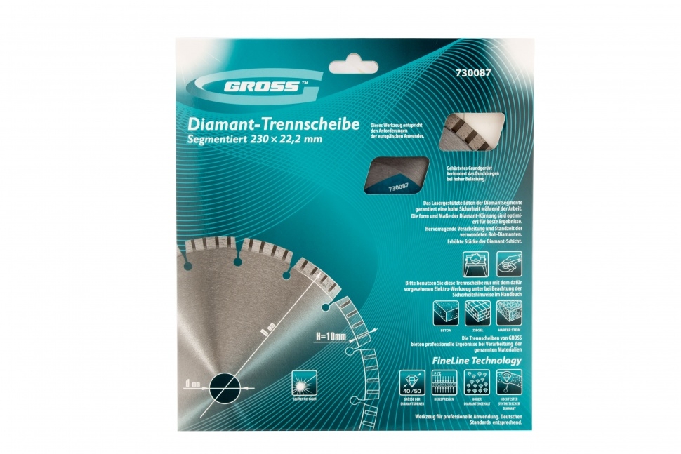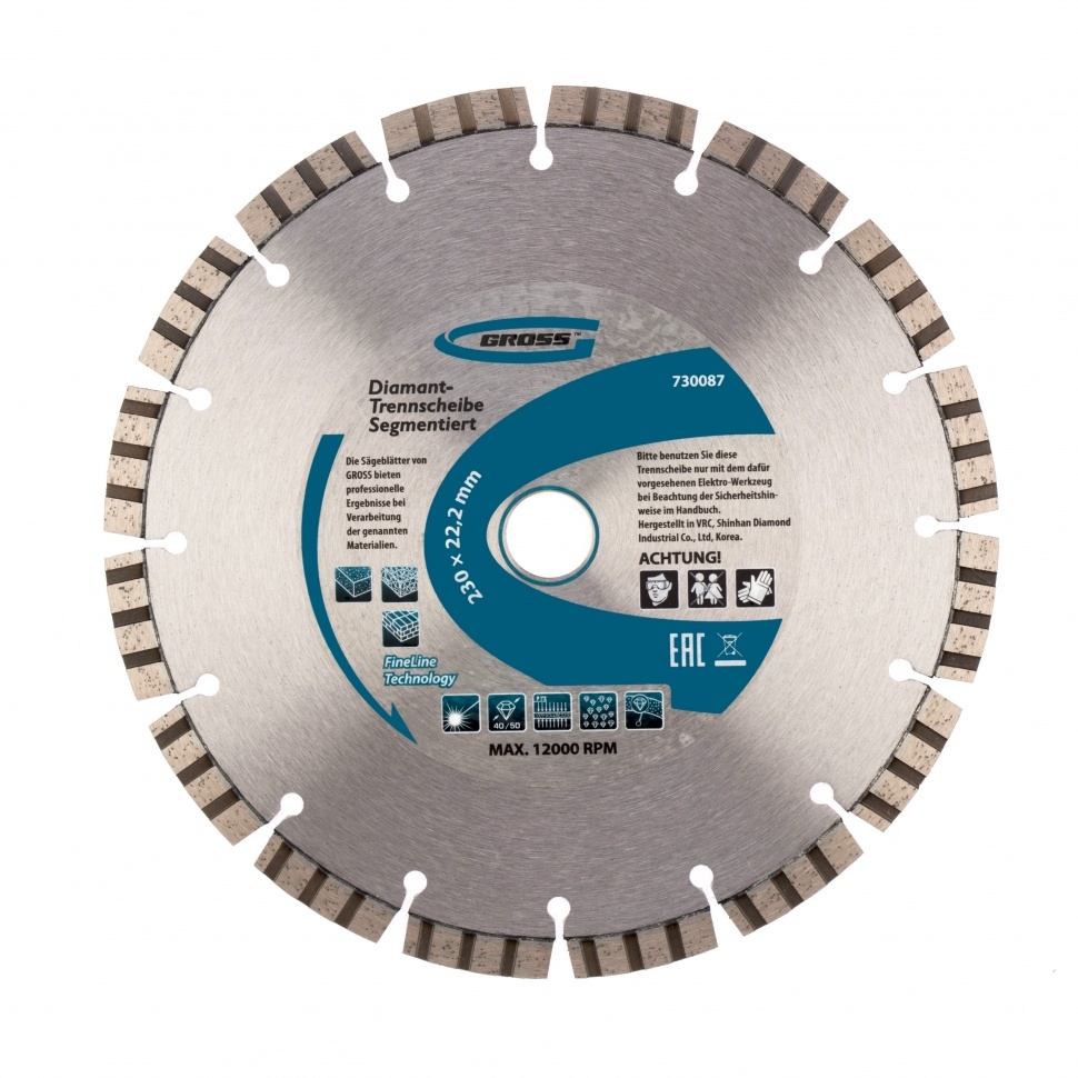 Алмазный диск Gross ф230х22,2 мм 730087 с лазерной приваркой турбо-сегментов предназначен для сухого резания бетона, в том числе свежего, слабоармированного железобетона, кирпича, песчаника и гранита. Посадочный диаметр 22,2 мм позволяет использовать диск в качестве расходного инструмента для УШМ. Турбо-сегменты обеспечивают быстрое сухое резание без необходимости водяного охлаждения. За счет оптимально подобранной связки диск выдерживает перегрузки и подходит как для интенсивного бытового, так и для профессионального применения, когда требуется выполнить большой объем работ.Преимущества Турбо-сегментная форма &mdash диск универсален по своему применению, позволяет быстро резать материалы, в т.ч. слабоармированный бетон без риска деформации. Лазерная приварка турбо-сегментов &mdash режущий алмазный слой прочно фиксируются на корпусе, такая технология изготовления гарантирует надежность диска и высокую стойкость к нагрузкам. Ширина алмазного слоя 10 мм &mdash диск гарантирует высокую производительность выполня