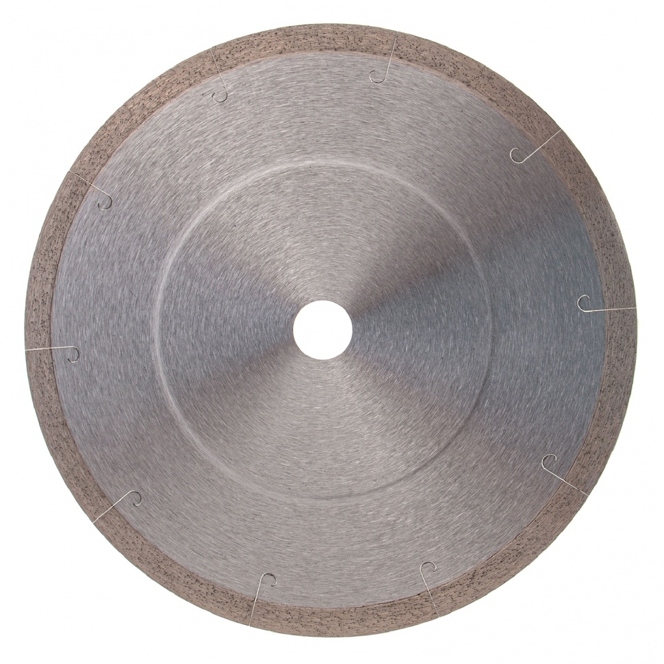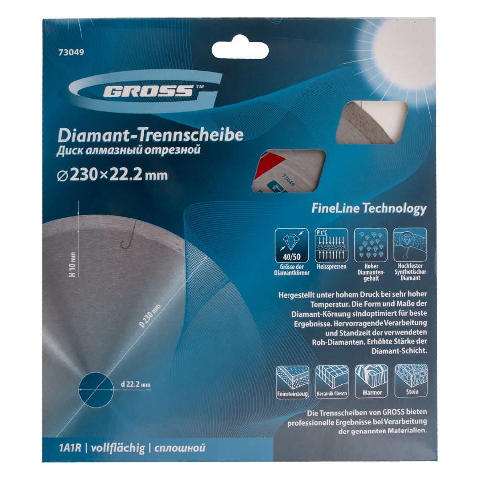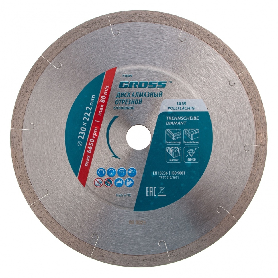 Сплошной алмазный диск Gross ф230х22,2 мм 73049 с лазерной перфорацией для мокрого резания используется в качестве расходника на УШМ или плиткорезах с посадочным размером 22,2 мм. Оптимальное соотношение серебра, кобальта и других качественных компонентов в металлической связке позволяет работать с гранитом, керамикой, керамогранитом, мрамором, натуральным и искусственным камнем. Метод мокрого шлифования подразумевает использование водяного охлаждения, что способствует снижению перегрева и эффективному отводу пыли.Преимущества Диск имеет большой ресурс, надежность и может использоваться профессионально, т.к. изготовлен по технологии горячего прессования. За счет сплошного типа диска обеспечивается качественный ровный срез без риска образования сколов. Высокая концентрация и крупный размер алмазов 40-50 мкм повышают скорость реза. Лазерная перфорация усиливает охлаждение диска, а значит, он легко выдерживает интенсивное использование. Режущая часть шириной 10 мм гарантирует стабильно высокую производительность