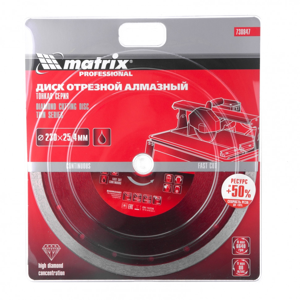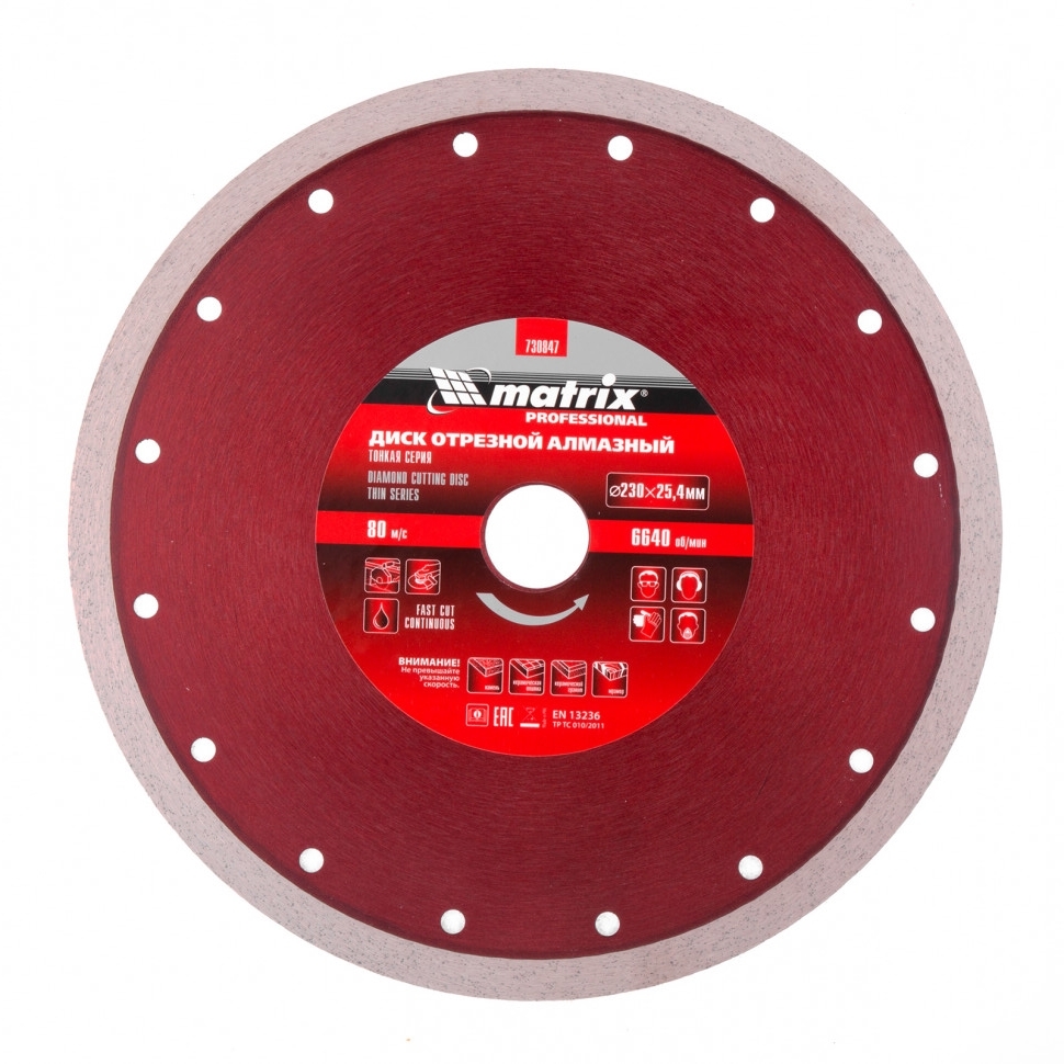 Тонкий сплошной алмазный диск Matrix 230 х 25,4 мм 730847 обеспечивает мокрое резание плотных материалов: керамогранита, керамической и кафельной плитки, мрамора, натурального и искусственного камня. Он устанавливается на УШМ или плиткорезы и используется с применением водяного охлаждения. Диск увеличивает производительность на 20% благодаря небольшой толщине 2,1 мм и снижению нагрузки на инструмент. Сплошная форма и перфорированный корпус позволяют добиться высокого качества реза и предотвращают появление сколов.