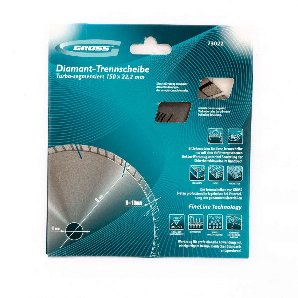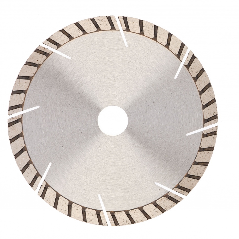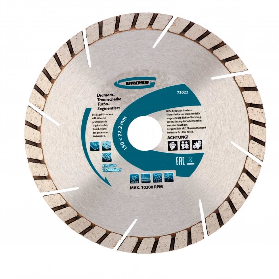 Алмазный турбо-сегментный диск Gross ф150х22,2 мм 73022 для сухого резания устанавливается на УШМ в качестве оснастки для проведения отрезных работ. Диск с турбированной рабочей частью универсален по своему применению и его можно использовать для резки камня, гранита и кирпича, свежего бетона, а также слабоармированного железобетона. Он пригодится для интенсивных работ с профессиональным инструментом.Преимущества Турбо-сегментная форма &mdash резание материалов происходит быстро, водяное охлаждение не требуется, в т.ч. армированного бетона. Надежность &mdash диск выполнен методом горячего прессования. Износостойкость и скорость реза до 10200 об/мин &mdash режущая часть выполнена из крупных алмазов размером 40-50 мкм. Рабочая часть 10 мм с высокой концентрацией алмазных зерен &mdash диск идеально подходит для выполнения больших объемов работ. Оптимально подобранная металлическая связка &mdash серебро, кобальт и другие составляющие значительно повышают ресурс диска, позволяют резать материалы разной плотности б