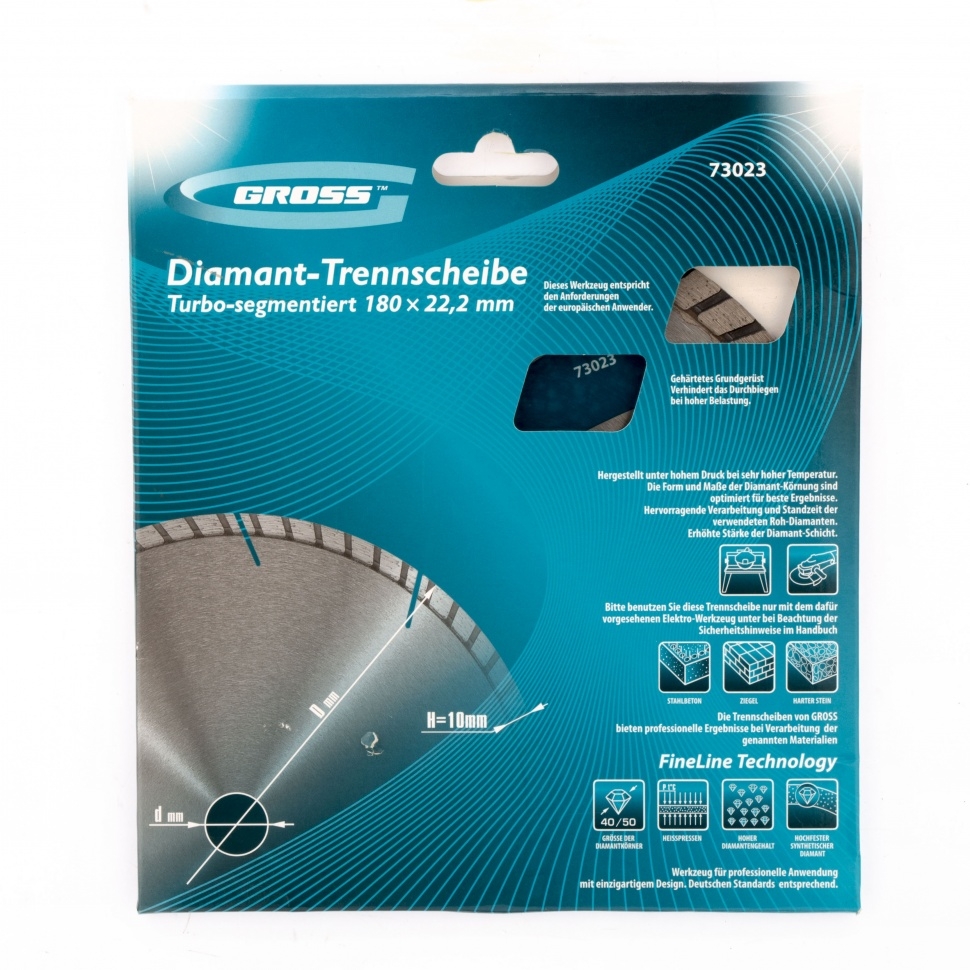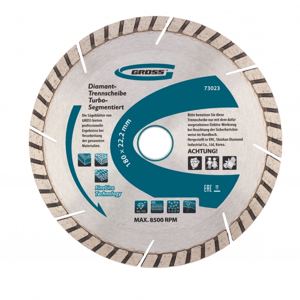 Алмазный турбо-сегментный диск Gross ф180х22,2 мм 73023 для сухого резания устанавливается на УШМ в качестве оснастки для проведения отрезных работ. Диск с турбированной рабочей частью универсален по своему применению и его можно использовать для резки камня, гранита и кирпича, свежего бетона, а также слабоармированного железобетона. Он пригодится для интенсивных работ с профессиональным инструментом.Преимущества Турбо-сегментная форма &mdash резание материалов происходит быстро, водяное охлаждение не требуется, в т.ч. армированного бетона. Надежность &mdash диск выполнен методом горячего прессования. Износостойкость и скорость реза до 8500 об/мин &mdash режущая часть выполнена из крупных алмазов размером 40-50 мкм. Рабочая часть 10 мм с высокой концентрацией алмазных зерен &mdash диск идеально подходит для выполнения больших объемов работ. Оптимально подобранная металлическая связка &mdash серебро, кобальт и другие составляющие значительно повышают ресурс диска, позволяют резать материалы разной плотности бе