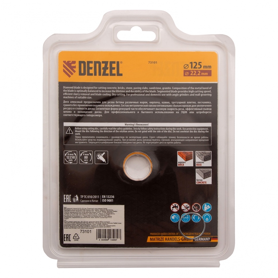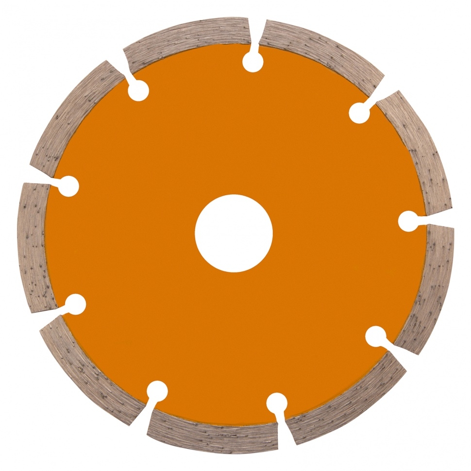 Отрезной алмазный диск Denzel Сегментный ф125 х 22,2 мм 73101 используется для сухого резания по свежему и старому бетону, камню, кирпичу, шлакоблоку, мрамору, тротуарной плитке. Он применяется в качестве сменного инструмента с профессиональными и бытовыми УШМ. Диск сегментного типа отличается высокой производительностью даже при интенсивных нагрузках, не требует водяного охлаждения.Преимущества Эффективность реза плотных материалов обеспечивает сбалансированная металлическая связка, устойчивая к перегреву и перегрузкам. Рабочая часть с высококонцентрированным алмазным слоем шириной 7 мм повышает скорость реза и износостойкость диска. Диск разделен на сегменты, что способствует хорошему отводу пыли во время работы. Изготовление по технологии холодного прессования позволяет добиться хороших режущих свойств диска.