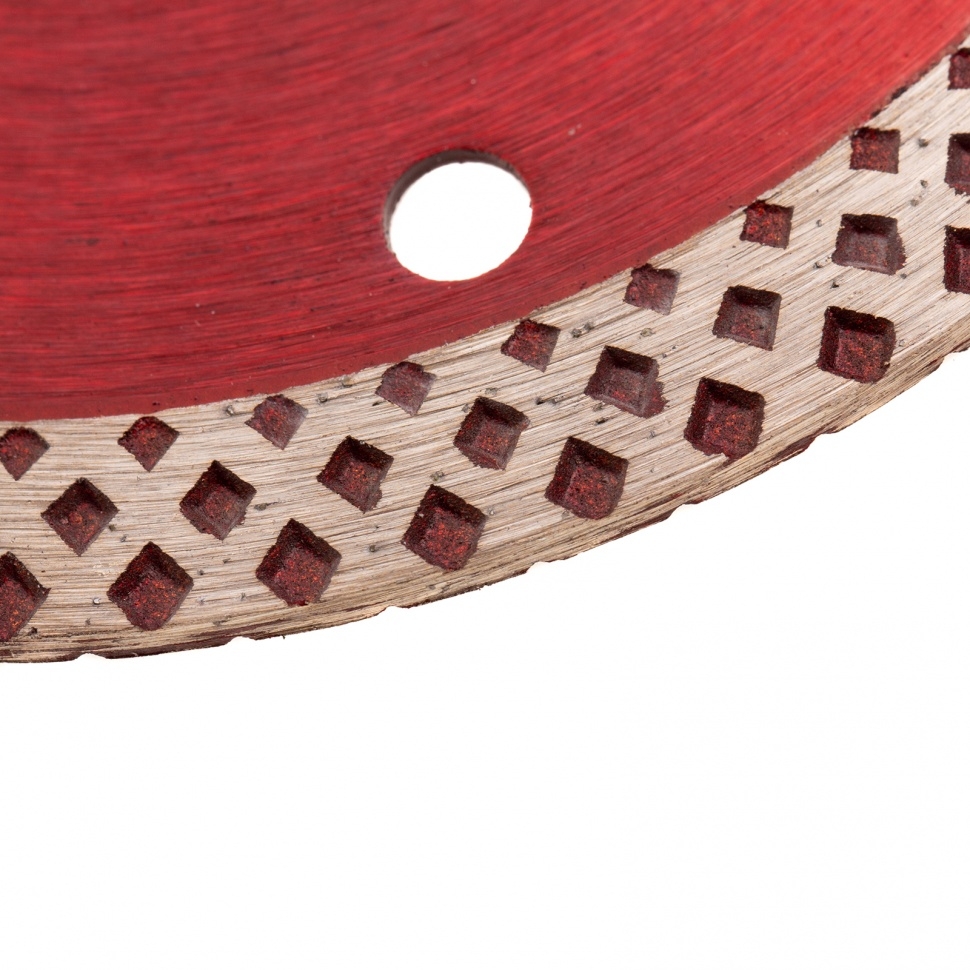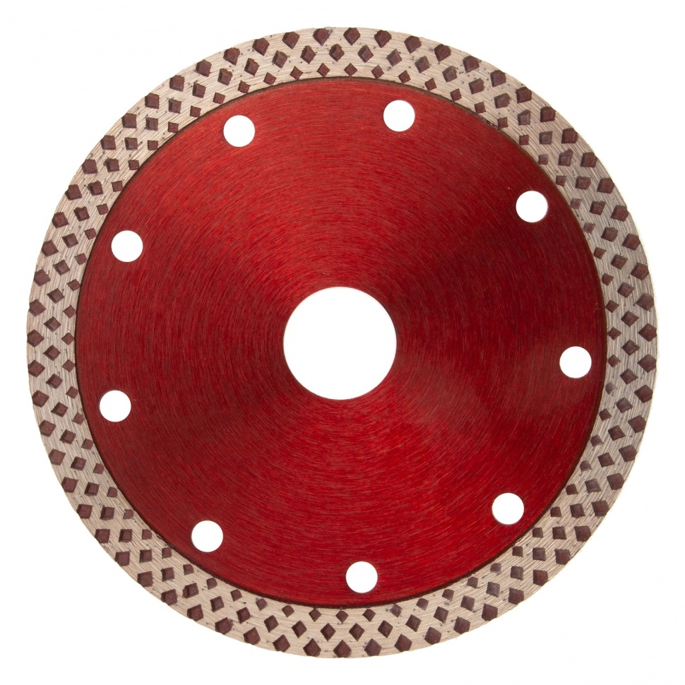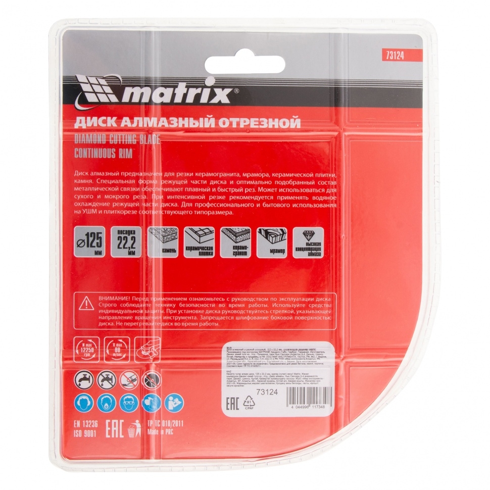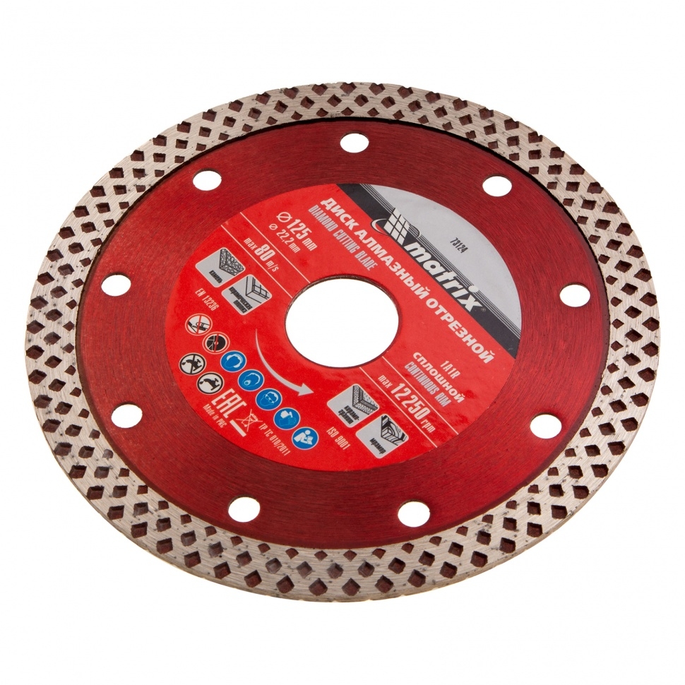 Отрезной алмазный диск Matrix 73124, сплошной, 125 мм &mdash оснастка для болгарок и плиткорезов с диаметром вала 22,2 мм. Он применяется для резки мрамора, искусственного и натурального камня, керамогранитной и керамической плитки. Использование без подачи воды расширяет возможности инструмента. Диск предназначен для бытового применения. Рекомендуется использовать водяное охлаждение для увеличения ресурса диска.Преимущества Благодаря высокой концентрации алмазов срез получается чистым и ровным. Режущая кромка шириной 10 мм способствует повышению производительности. Отверстия в корпусе диска способствуют активному охлаждению, что позволяет использовать диск для сухой резки. Диск выполнен нанесен методом холодного прессования, поэтому устойчив к механическим нагрузкам.