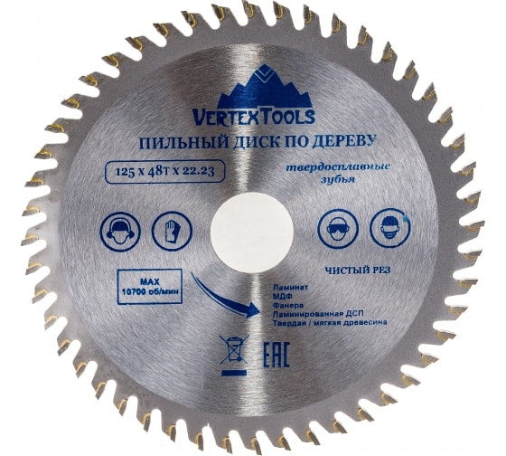 Пильный диск по дереву Vertextools 125-48-22 предназначен для выполнения точных продольных и поперечных чистовых пропилов в мягкой и твердой древесине, прессованной слоистой древесине, фанере, ламинате и ДСП.