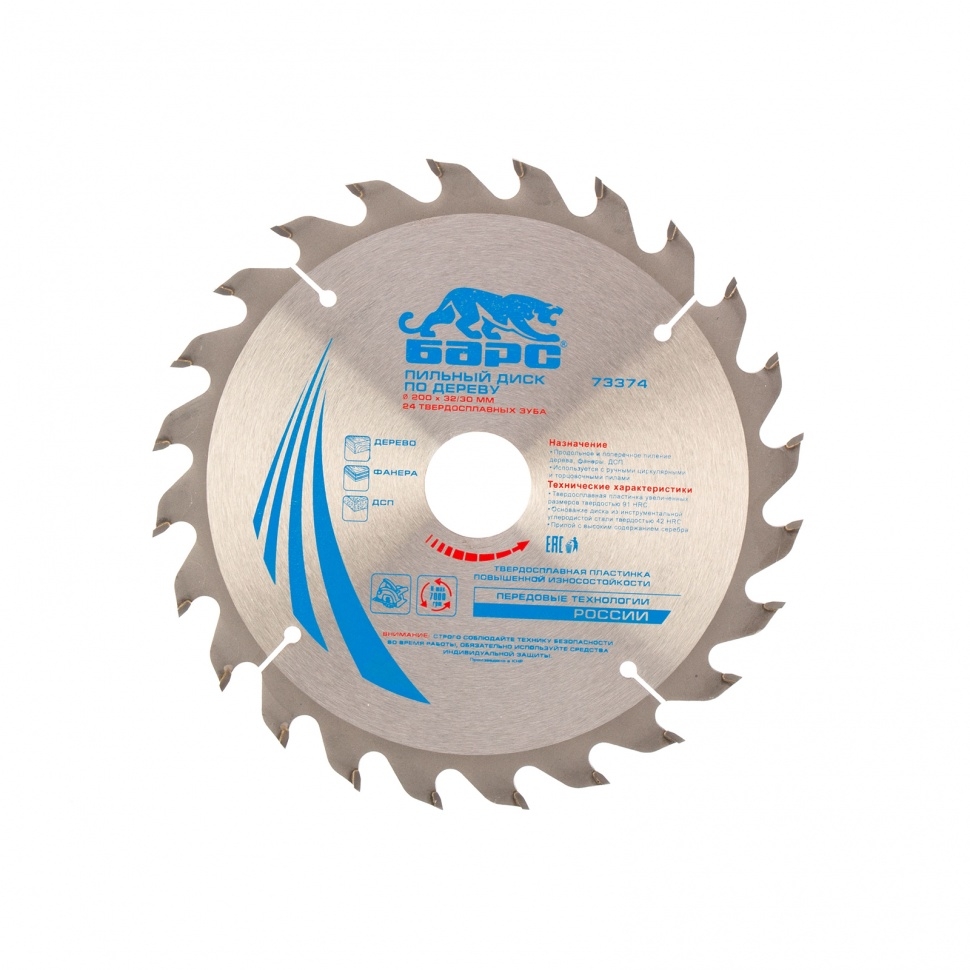 Пильный диск Барс 73374, ф200 х 32 мм, с 24 зубьями и кольцом 32/30 мм предназначен для быстрого пиления древесины мягких и твердых пород, ДСП, МДФ и фанеры. Тип зубьев АТВ и оптимально подобранный угол зуба позволяют производить как продольный, так и поперечный распил. Диск используется совместно с торцовочными и циркулярными пилами с посадкой 32 мм. В комплект входит переходное кольцо на диаметр 30 мм, расширяющее возможности применения оснастки. Диск подходит для интенсивной эксплуатации и может использоваться в профессиональной сфере. Повышенная износостойкость - пластины изготовлены из сплава YG8 твердостью свыше 88 HRА с добавлением легирующих компонентов, формирующих мелкозернистую структуру материала.