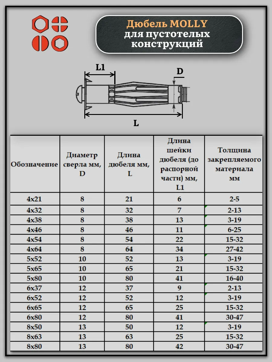 Дюбель MOLLY 6х65 для пустотелых конструкций, 10 шт.