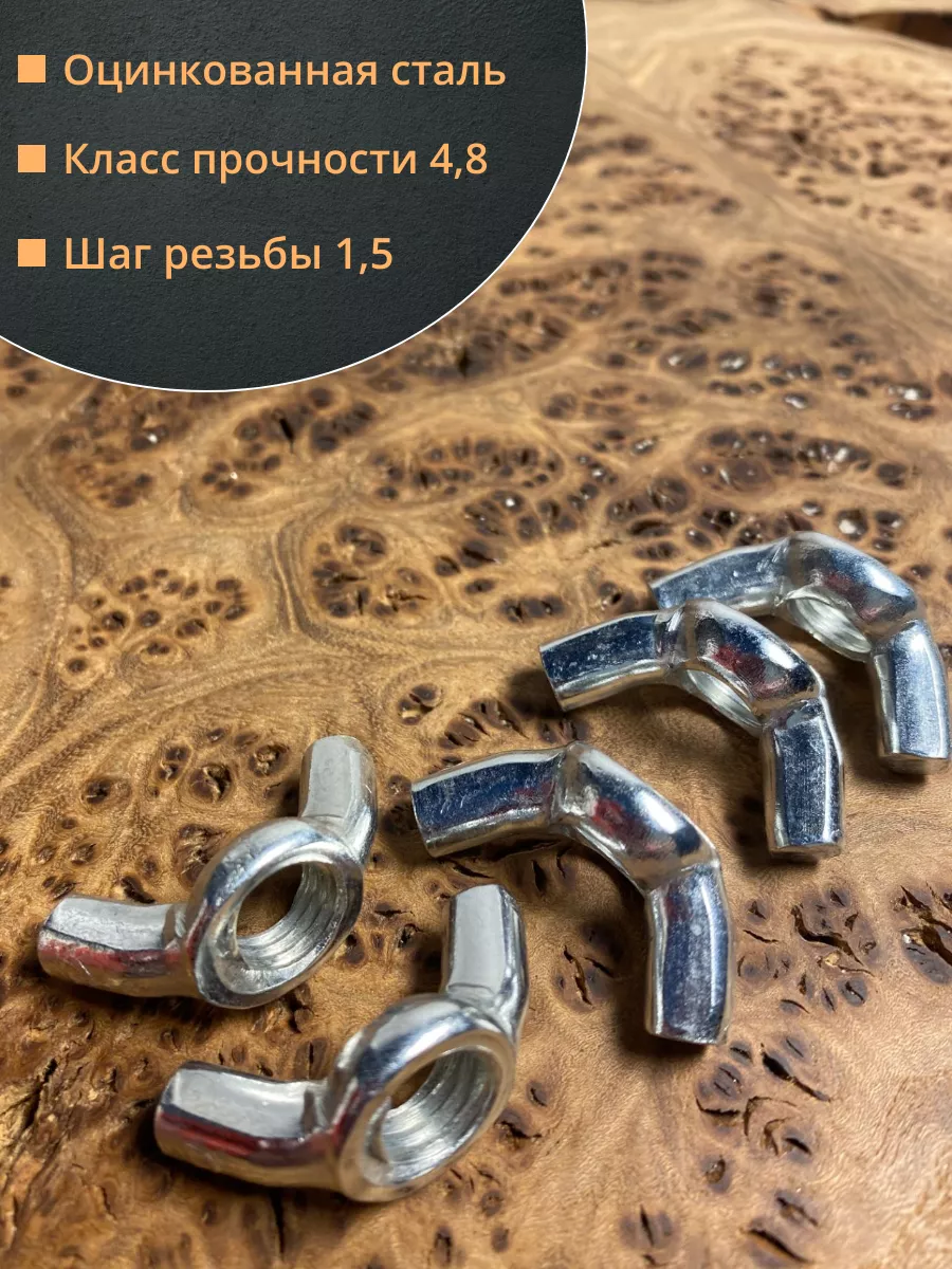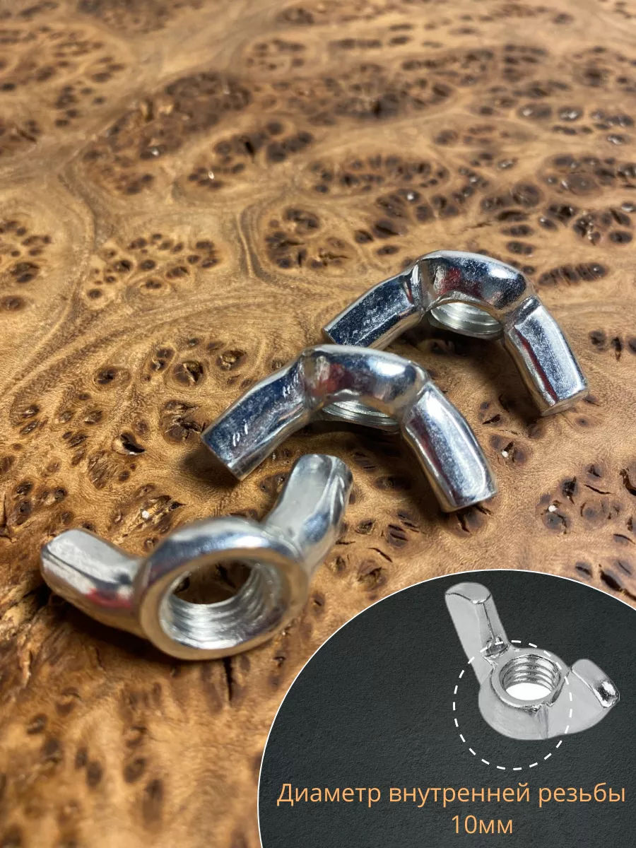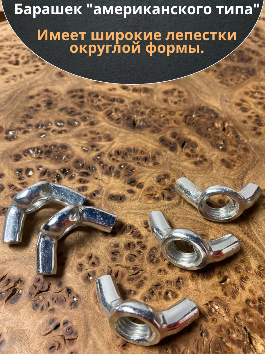 Гайка-барашек – крепежный элемент, имеющий в основе круглое отверстие с метрической резьбой, к которому крепятся два лепестка, вращение которых рукой позволяет затягивать или ослаблять крепление. Потребность в таком крепеже возникает в тех случаях, когда необходимо быстро затянуть или отпустить резьбу крепежа съемной детали, не являющейся элементом несущих конструкций. Изготавливается из оцинкованной или нержавеющей стали.
