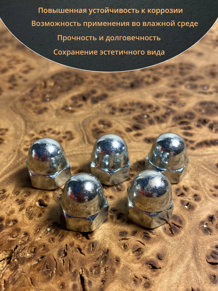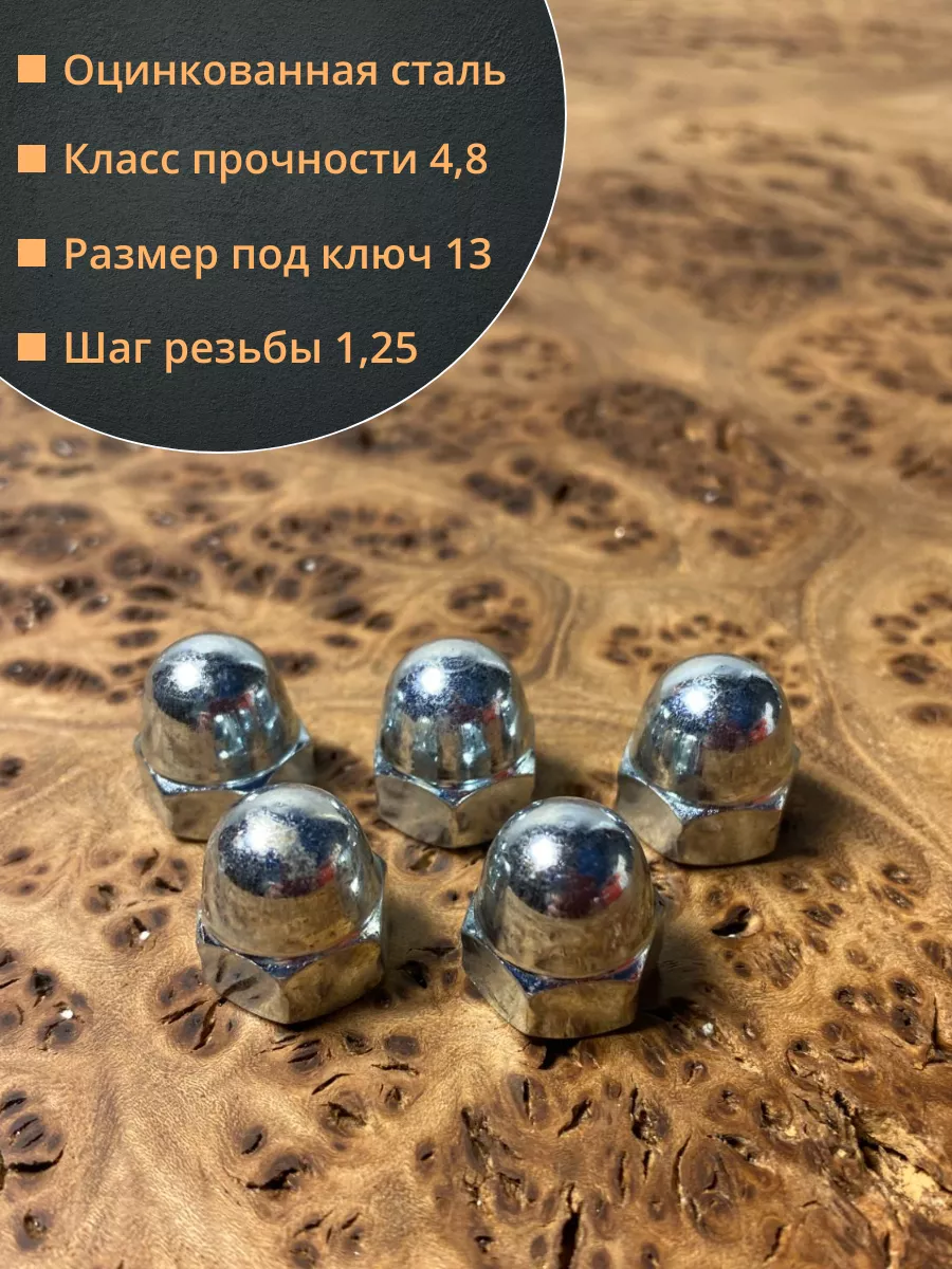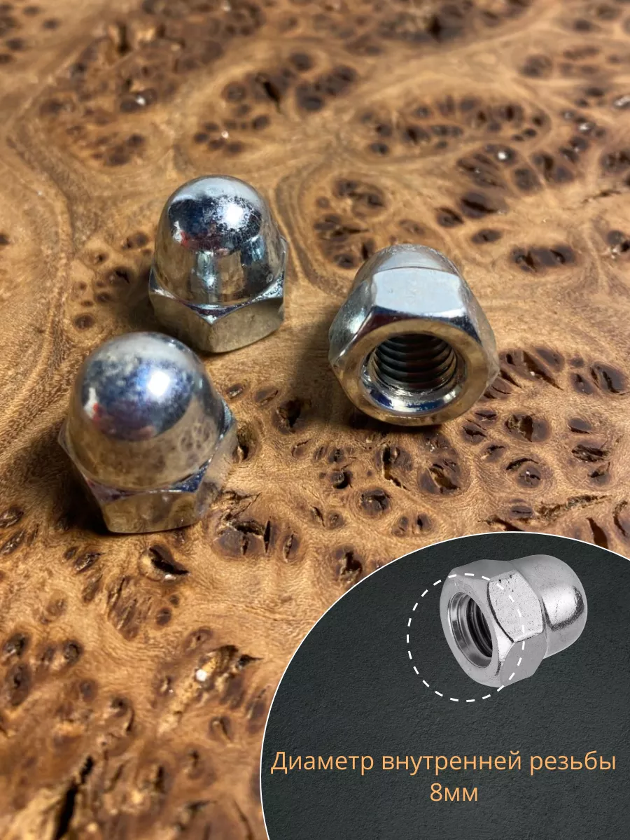 Колпачковая гайка представляет собой сочетание обычной шестигранной гайки и сферического колпачка и предусматривает 2 конструкции – сферические и более плоские. Они различаются между собой глубиной колпачка. Они применяются везде, где требуется красивое и надежное резьбовое соединение. Гайки производятся из углеродистой стали ( с покрытием и без), нержавейки, латуни, алюминия. Стандартом DIN 1587 допускается обработка поверхности гаек для создания защитного никелевого или цинкового слоя.