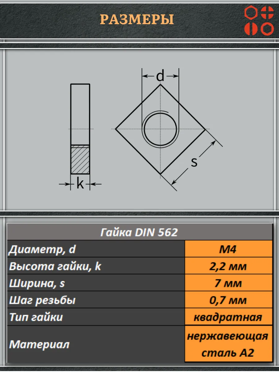 Гайка квадратная М4 нержавеющая низкая DIN562, 50 шт.