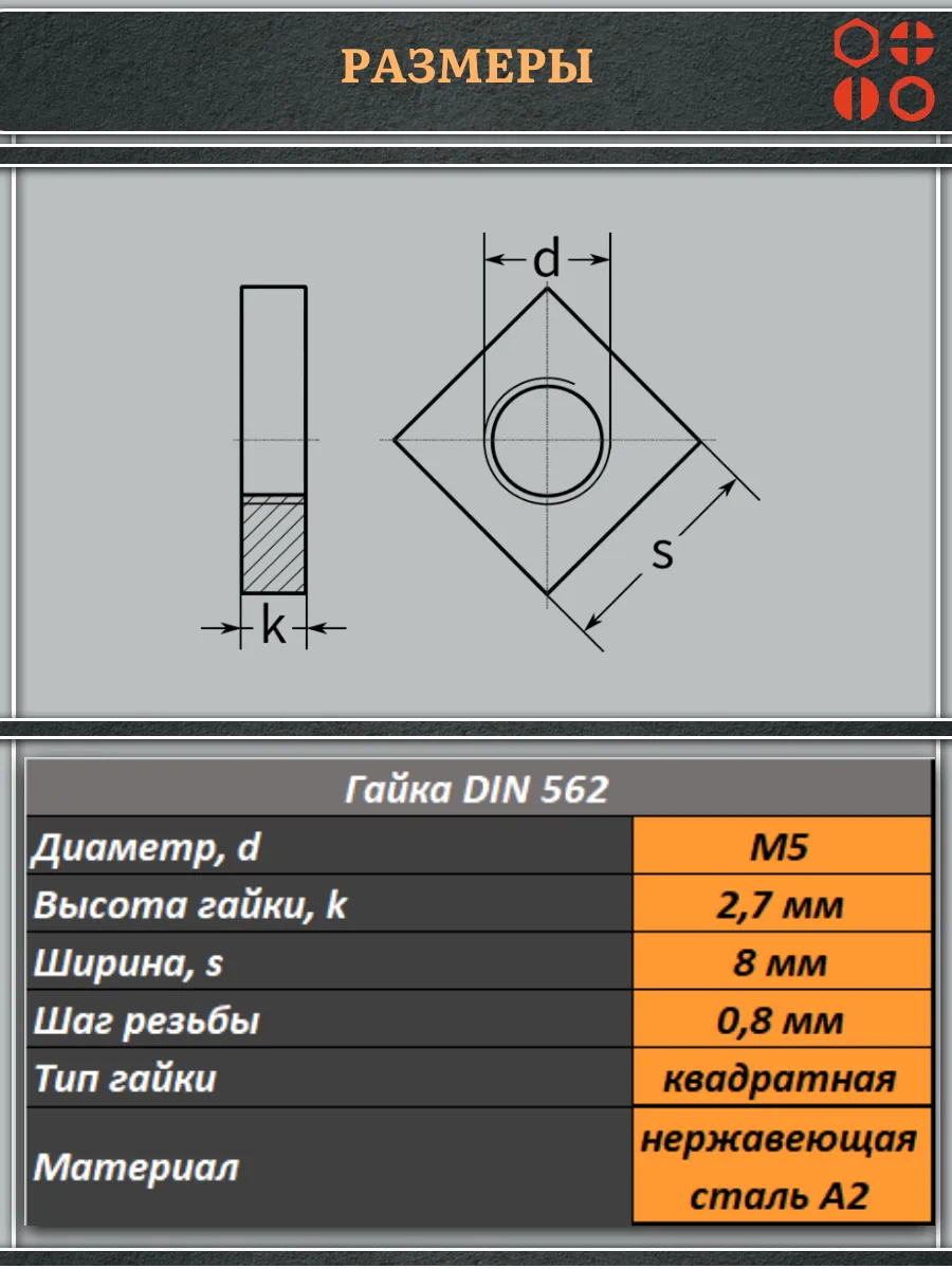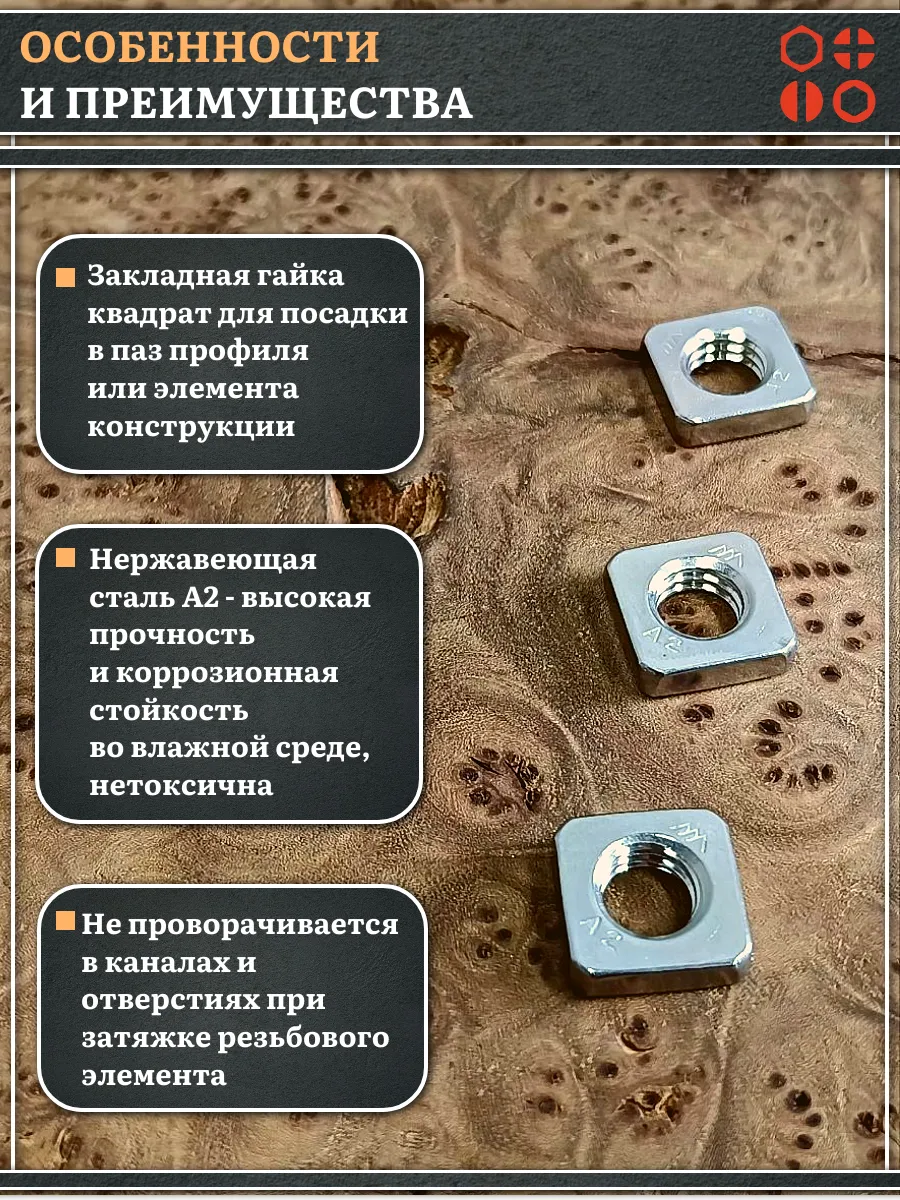 | Гайка квадратная М5 нержавеющая низкая DIN562, 10 шт. | 00-00024096ф10 | 1 шт. |