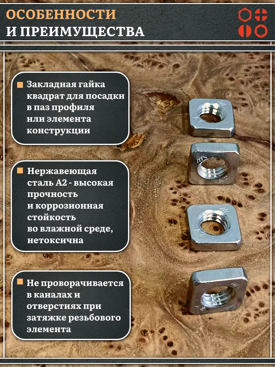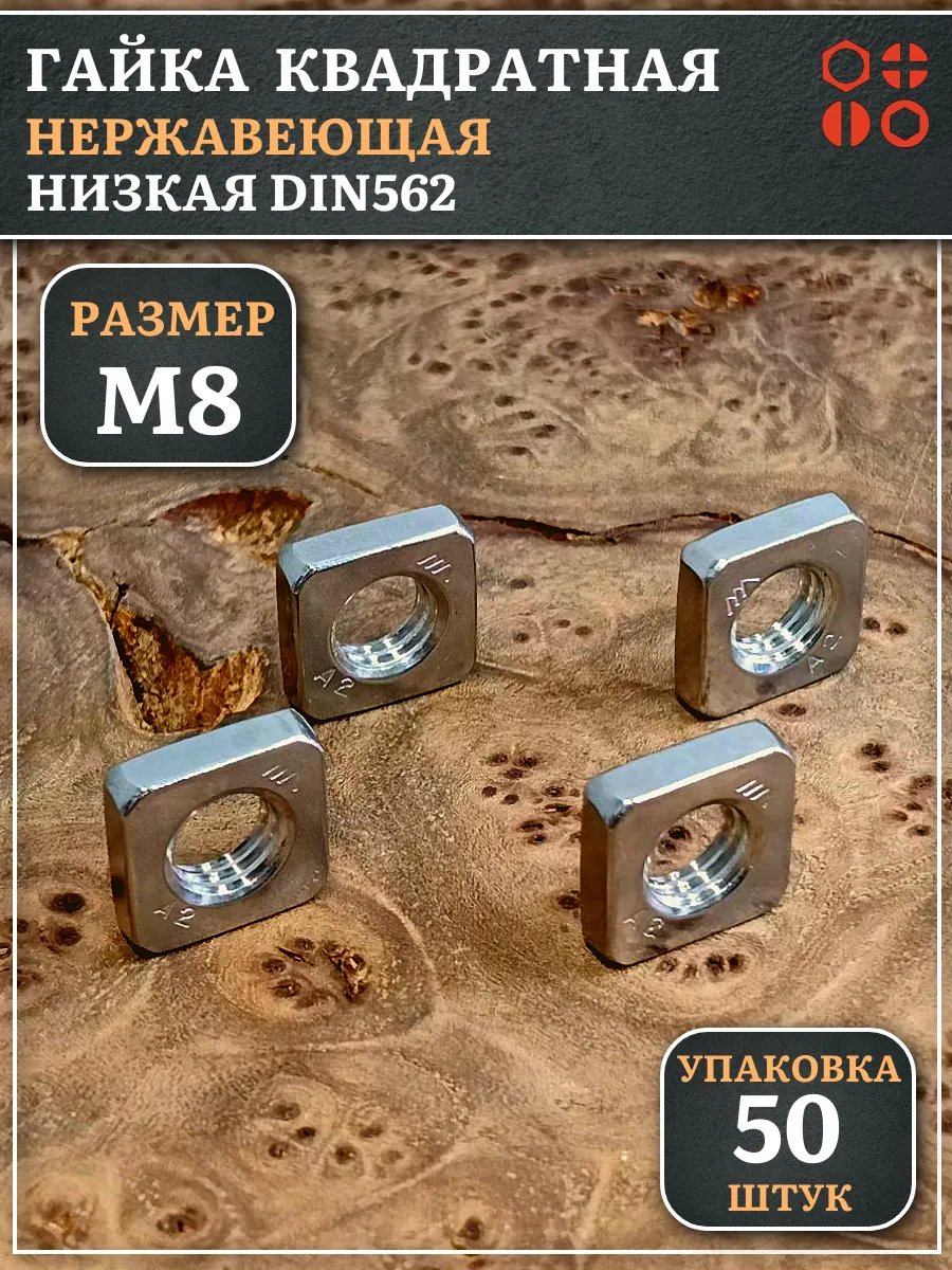 Гайка квадратная М8 нержавеющая низкая DIN562, 50 шт.