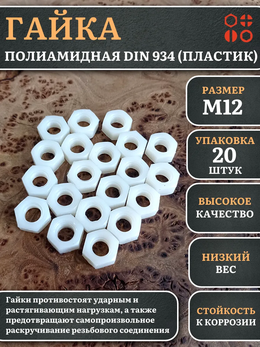 Гайка полиамидная М12 DIN934 (пластик), 20 шт.