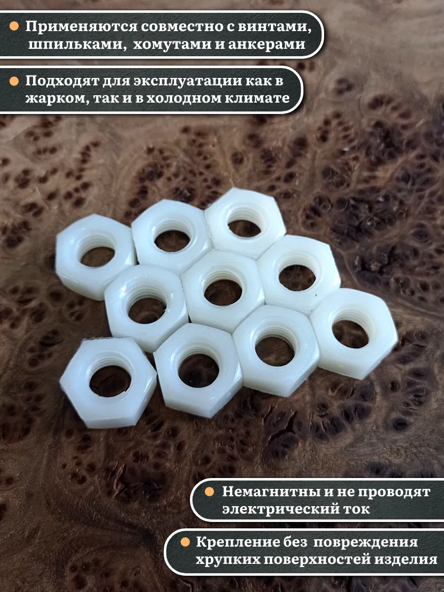 Гайки из пластика, изготовленные из полиамида и соответствующие стандарту DIN 934, используются для предотвращения самопроизвольного раскручивания резьбовых соединений. Вместе с ними применяют полиамидные шайбы, которые служат в качестве уплотнительной прокладки. Это позволяет увеличить площадь контакта и защитить соединяемые детали от повреждений.